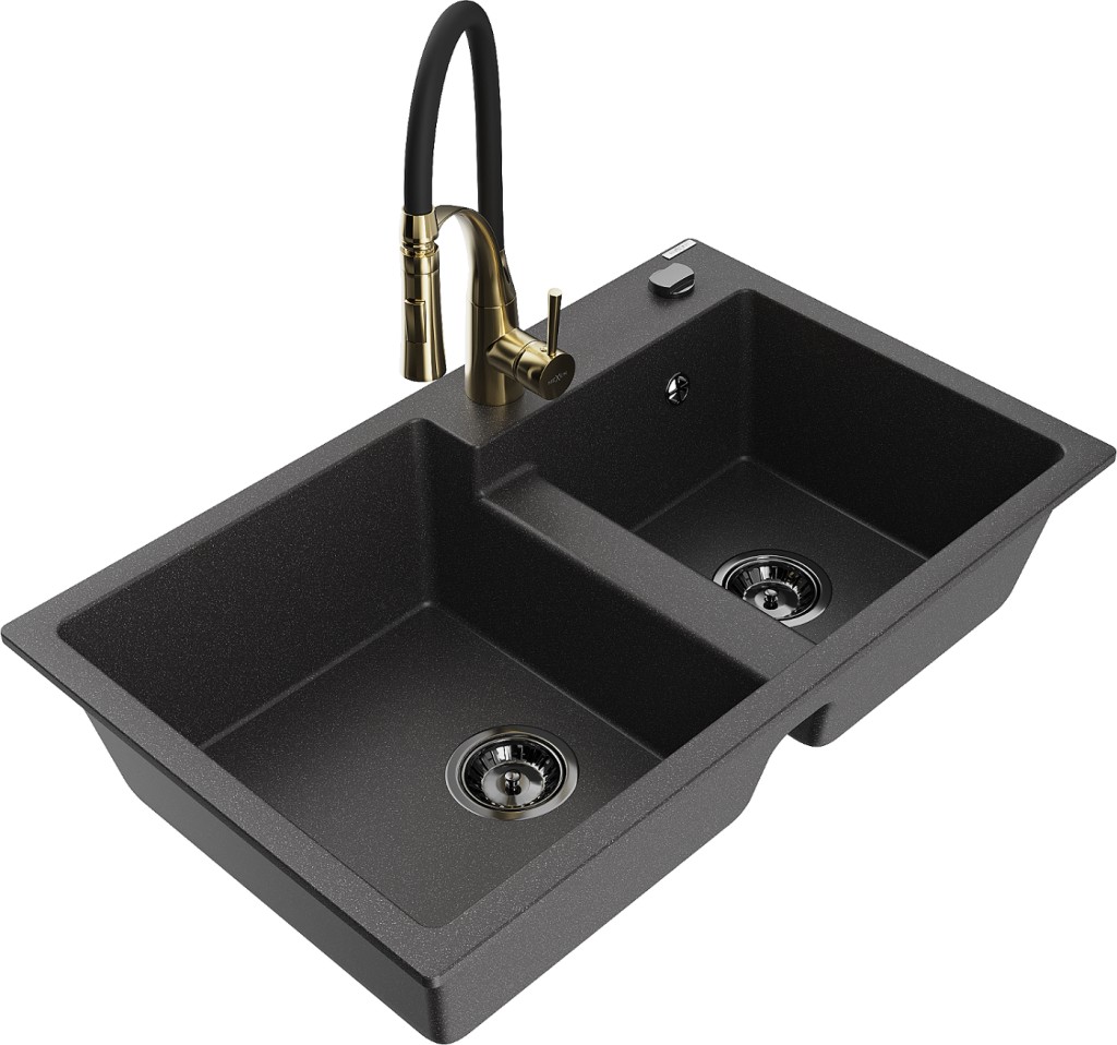 Technické dáta: Drez: Rozmer: 800x500x190 mm Hĺbka komory: 180 mm (väčšia), 180 mm (menšia) Rozmery komory: 440x387 mm (väčšie), 370x303 mm (menšie) Priemer odtoku: ø90 mm Typ: 2-komorový Typ: Zapustené do pracovnej dosky Materiál: žula Farba: Škvrnitá čierna Povrchová úprava sifónu: čierna Materiál: žula (80% žulové kamenivo 20% živice) Prepadový otvor: Áno Otvory: (batérie, automat) 2 Vysoká odolnosť proti poškriabaniu a zmene farby Odolnosť proti tepelným šokom Povrch pre ľahké čistenie Jeden dodatočný vyfrézovaný otvor na samodierovanie ø35 Kuchynská batéria: Materiál: mosadz Farba: Zlatá/Čierna Hlava: Keramická Perlátor: Áno Typ výtoku: Flexibilný s mosadznou podperou Typ: Jednopáková Výška batérie: 430 mm Rozsah výtoku: 235 mm(GT) Ean: 5905315048318