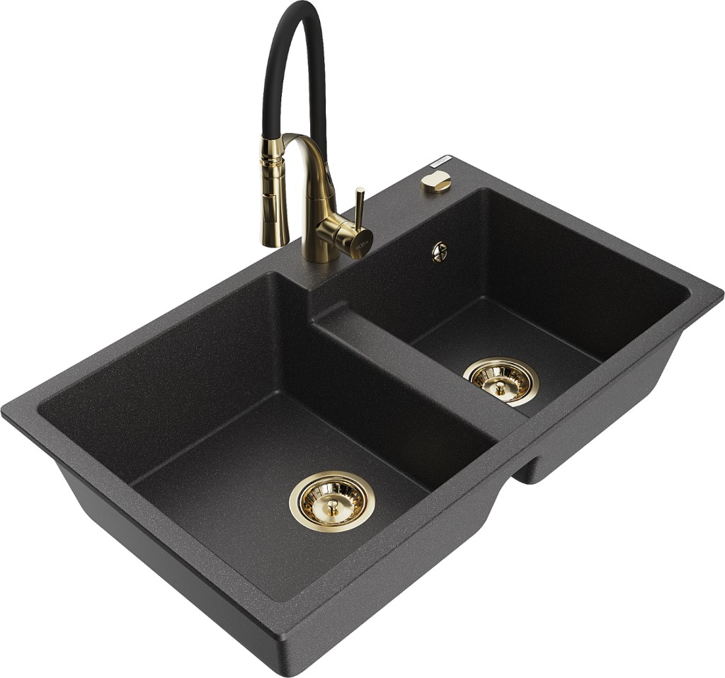 Technické dáta: Drez: Rozmer: 800x500x190 mm Hĺbka komory: 180 mm (väčšia), 180 mm (menšia) Rozmery komory: 440x387 mm (väčšie), 370x303 mm (menšie) Priemer odtoku: ø90 mm Typ: 2-komorový Typ: Zapustené do pracovnej dosky Materiál: žula Farba: Škvrnitá čierna Povrchová úprava sifónu: zlatá Materiál: žula (80% žulové kamenivo 20% živice) Prepadový otvor: Áno Otvory: (batérie, automat) 2 Vysoká odolnosť proti poškriabaniu a zmene farby Odolnosť proti tepelným šokom Povrch pre ľahké čistenie Jeden dodatočný vyfrézovaný otvor na samodierovanie ø35 Kuchynská batéria: Materiál: mosadz Farba: Zlatá/Čierna Hlava: Keramická Perlátor: Áno Typ výtoku: Flexibilný s mosadznou podperou Typ: Jednopákové Výška batérie: 430 mm Rozsah výtoku: 235 mm(GT) Ean: 5905315048301