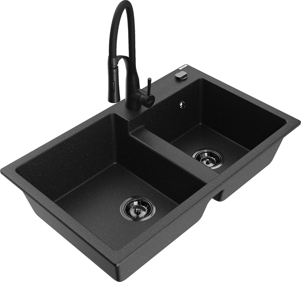 Technické dáta: Drez: Rozmer: 800x500x190 mm Hĺbka komory: 180 mm (väčšia), 180 mm (menšia) Rozmery komory: 440x387 mm (väčšie), 370x303 mm (menšie) Priemer odtoku: ø90 mm Typ: 2-komorový Typ: Zapustené do pracovnej dosky Materiál: žula Farba: čierna/strieborná metalíza Povrchová úprava sifónu: čierna Materiál: žula (80% žulové kamenivo 20% živice) Prepadový otvor: Áno Otvory: (batérie, automat) 2 Vysoká odolnosť proti poškriabaniu a zmene farby Odolnosť proti tepelným šokom Povrch pre ľahké čistenie Jeden dodatočný vyfrézovaný otvor na samodierovanie ø35 Kuchynská batéria: Materiál: mosadz Čierna farba Hlava: Keramická Perlátor: Áno Typ výtoku: Flexibilný s mosadznou podperou Typ: Jednopákové Výška batérie: 430 mm Rozsah výtoku: 235 mm(GT) Ean: 5905315048202