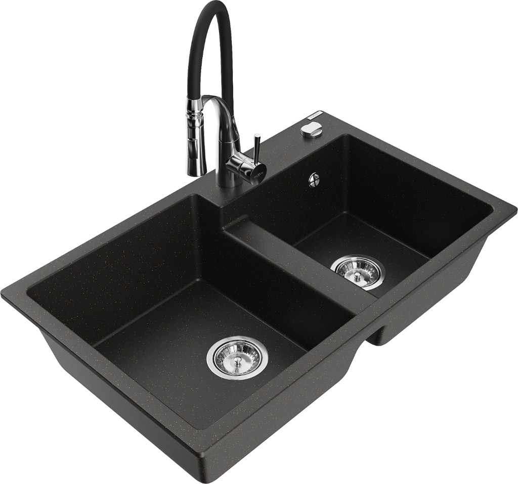 Technické dáta: drez: Rozmer: 800 x 500 x 190 mm Hĺbka komory: 180 mm (väčšia), 180 mm (menšia) Rozmery komory: 440x387 mm (väčšie), 370x303 mm (menšie) Priemer odtoku: ø90 mm Typ: 2-komorový Typ: Zapustené do pracovnej dosky Materiál: žula Farba: čierna / zlatá metalíza Povrchová úprava sifónu: Chrome Materiál: žula (80% žulové kamenivo, 20% živice) Prepadový otvor: Áno Otvory: (batérie, automatické) 2 Vysoká odolnosť proti poškriabaniu a zmene farby Odolnosť proti tepelným šokom Ľahko čistiteľný povrch Jeden dodatočný vyfrézovaný otvor na samodierovanie ø35 kuchynská batéria: Materiál: mosadz Farba: chróm/čierna Hlava: Keramická Prevzdušňovač: Áno Typ: Jedna páka Výška batérie: 430 mm Rozsah výtoku: 185 mm Batéria má výsuvný výtok(GT) Ean: 5905315048226