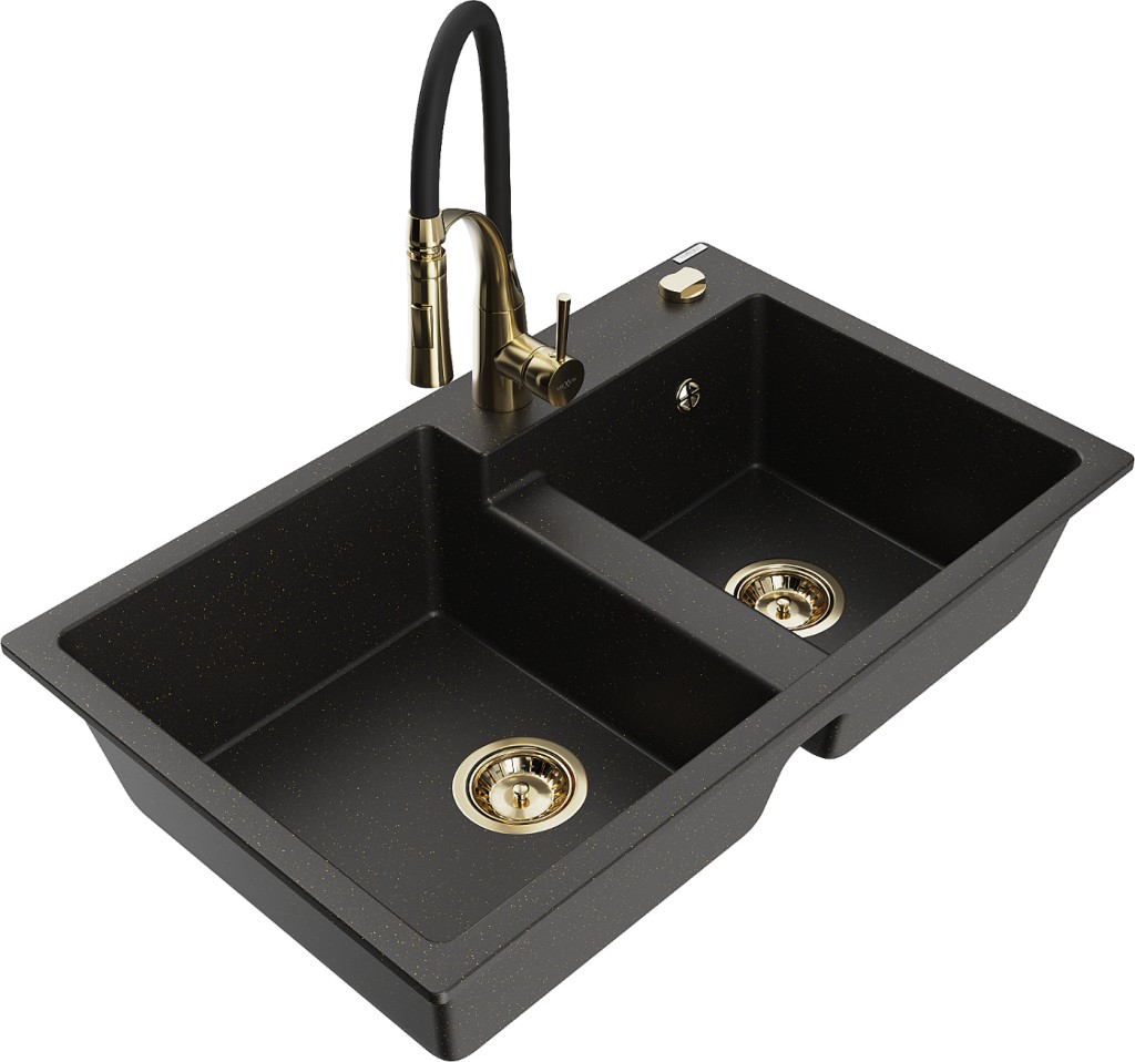 Technické dáta: drez: Rozmer: 800 x 500 x 190 mm Hĺbka komory: 180 mm (väčšia), 180 mm (menšia) Rozmery komory: 440x387 mm (väčšie), 370x303 mm (menšie) Priemer odtoku: ø90 mm Typ: 2-komorový Typ: Zapustené do pracovnej dosky Materiál: žula Farba: čierna / zlatá metalíza Povrchová úprava sifónu: zlatá Materiál: žula (80% žulové kamenivo, 20% živice) Prepadový otvor: Áno Otvory: (batérie, automatické) 2 Vysoká odolnosť proti poškriabaniu a zmene farby Odolnosť proti tepelným šokom Ľahko čistiteľný povrch Jeden dodatočný vyfrézovaný otvor na samodierovanie ø35 kuchynská batéria: Materiál: mosadz Farba: Zlatá/Čierna Hlava: Keramická Prevzdušňovač: Áno Typ: Jedna páka Výška batérie: 430 mm Rozsah výtoku: 185 mm Batéria má výsuvný výtok(GT) Ean: 5905315048240