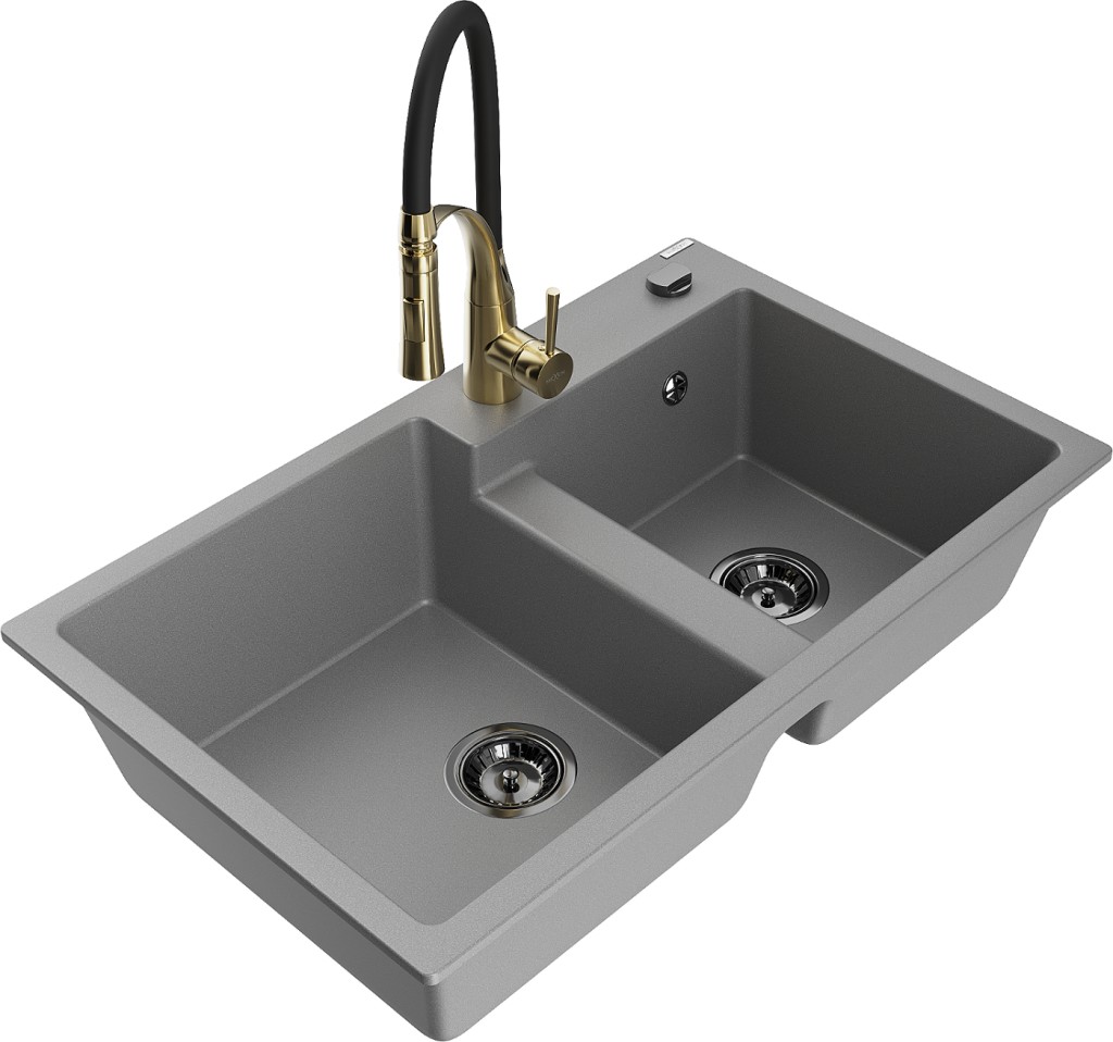 Technické dáta: drez: Rozmer: 800 x 500 x 190 mm Hĺbka komory: 180 mm (väčšia), 180 mm (menšia) Rozmery komory: 440x387 mm (väčšie), 370x303 mm (menšie) Priemer odtoku: ø90 mm Typ: 2-komorový Typ: Zapustené do pracovnej dosky Materiál: žula Šedá farba Povrchová úprava sifónu: čierna Materiál: žula (80% žulové kamenivo, 20% živice) Prepadový otvor: Áno Otvory: (batérie, automatické) 2 Vysoká odolnosť proti poškriabaniu a zmene farby Odolnosť proti tepelným šokom Ľahko čistiteľný povrch Jeden dodatočný vyfrézovaný otvor na samodierovanie ø35 kuchynská batéria: Materiál: mosadz Farba: Zlatá/Čierna Hlava: Keramická Prevzdušňovač: Áno Typ hubica: Flexibilný s mosadzným držiakom Typ: Jedna páka Výška batérie: 430 mm Rozsah výtoku: 235 mm(GT) Ean: 5905315048134