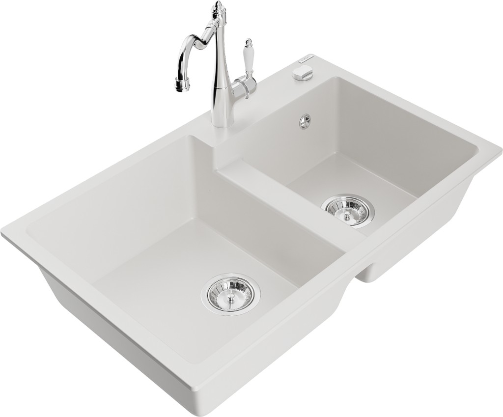 Technické dáta: drez: Rozmer: 800 x 500 x 190 mm Hĺbka komory: 180 mm (väčšia), 180 mm (menšia) Rozmery komory: 440x387 mm (väčšie), 370x303 mm (menšie) Priemer odtoku: ø90 mm Typ: 2-komorový Typ: Zapustené do pracovnej dosky biela farba Povrchová úprava sifónu: Chrome Materiál: žula (80% žulové kamenivo, 20% živice) Prepadový otvor: Áno Otvory: (batérie, automatické) 2 Vysoká odolnosť proti poškriabaniu a zmene farby Odolnosť proti tepelným šokom Ľahko čistiteľný povrch Jeden dodatočný vyfrézovaný otvor na samodierovanie ø35 kuchynská batéria: Materiál: mosadz Farba: Chrome Hlava: Keramická Prevzdušňovač: Áno Typ: Jedna páka Výška batérie: 290 mm Rozsah výtoku: 260 mm(GT) Ean: 5905315041548