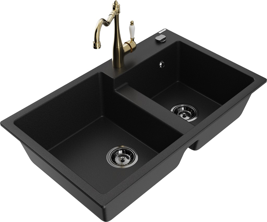 Technické dáta: drez: Rozmer: 800 x 500 x 190 mm Hĺbka komory: 180 mm (väčšia), 180 mm (menšia) Rozmery komory: 440x387 mm (väčšie), 370x303 mm (menšie) Priemer odtoku: ø90 mm Typ: 2-komorový Typ: Zapustené do pracovnej dosky Čierna farba Povrchová úprava sifónu: zlatá Materiál: žula (80% žulové kamenivo, 20% živice) Prepadový otvor: Áno Otvory: (batérie, automatické) 2 Vysoká odolnosť proti poškriabaniu a zmene farby Odolnosť proti tepelným šokom Ľahko čistiteľný povrch Jeden dodatočný vyfrézovaný otvor na samodierovanie ø35 kuchynská batéria: Materiál: mosadz Čierna farba Hlava: Keramická Prevzdušňovač: Áno Typ: Jedna páka Výška batérie: 290 mm Rozsah výtoku: 260 mm(GT) Ean: 5905315041838