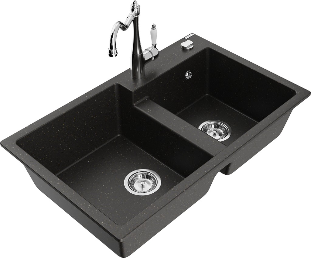 Technické dáta: drez: Rozmer: 800 x 500 x 190 mm Hĺbka komory: 180 mm (väčšia), 180 mm (menšia) Rozmery komory: 440x387 mm (väčšie), 370x303 mm (menšie) Priemer odtoku: ø90 mm Typ: 2-komorový Typ: Zapustené do pracovnej dosky Farba: čierna / zlatá metalíza Povrchová úprava sifónu: Chrome Materiál: žula (80% žulové kamenivo, 20% živice) Prepadový otvor: Áno Otvory: (batérie, automatické) 2 Vysoká odolnosť proti poškriabaniu a zmene farby Odolnosť proti tepelným šokom Ľahko čistiteľný povrch Jeden dodatočný vyfrézovaný otvor na samodierovanie ø35 kuchynská batéria: Materiál: mosadz Farba: Chrome Hlava: Keramická Prevzdušňovač: Áno Typ: Jedna páka Výška batérie: 290 mm Rozsah výtoku: 260 mm(GT) Ean: 5905315041715