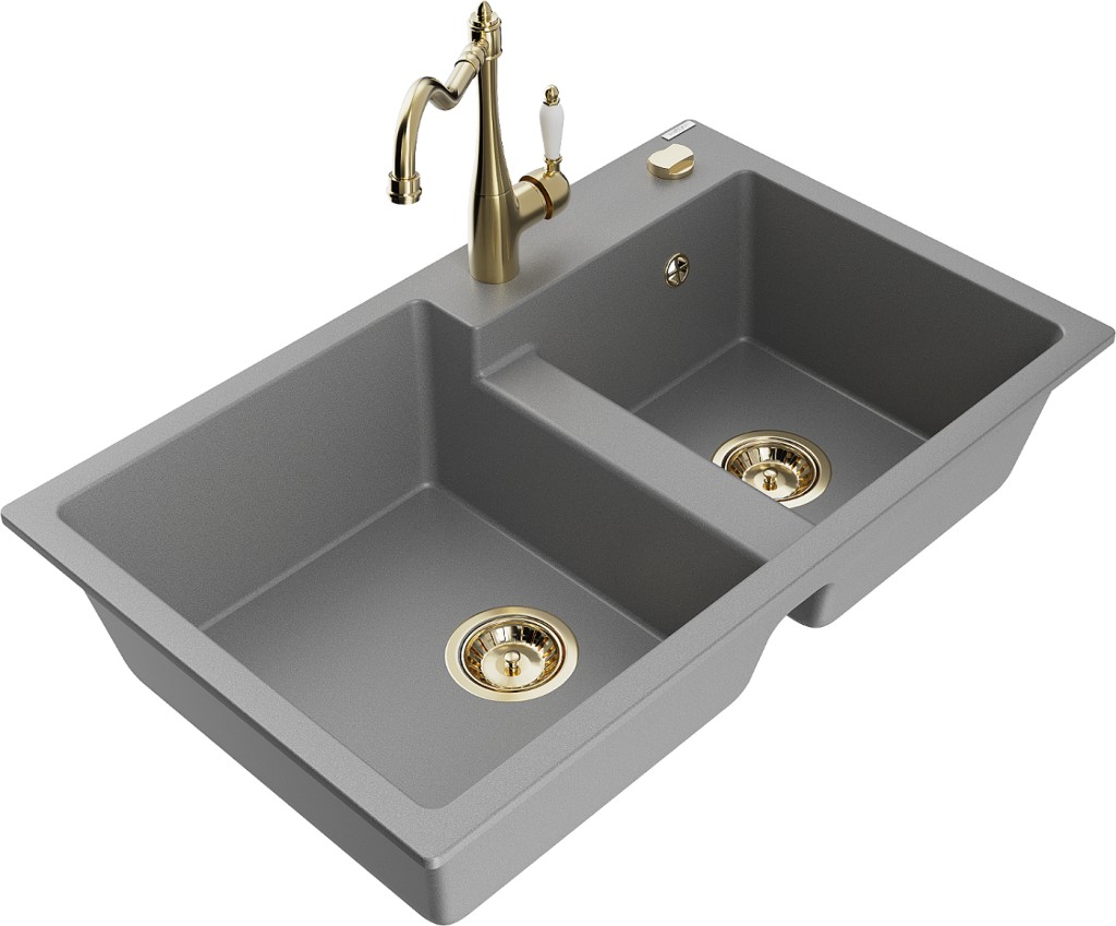 Technické dáta: drez: Rozmer: 800 x 500 x 190 mm Hĺbka komory: 180 mm (väčšia), 180 mm (menšia) Rozmery komory: 440x387 mm (väčšie), 370x303 mm (menšie) Priemer odtoku: ø90 mm Typ: 2-komorový Typ: Zapustené do pracovnej dosky Šedá farba Povrchová úprava sifónu: zlatá Materiál: žula (80% žulové kamenivo, 20% živice) Prepadový otvor: Áno Otvory: (batérie, automatické) 2 Vysoká odolnosť proti poškriabaniu a zmene farby Odolnosť proti tepelným šokom Ľahko čistiteľný povrch Jeden dodatočný vyfrézovaný otvor na samodierovanie ø35 kuchynská batéria: Materiál: mosadz Farba: Zlatá Hlava: Keramická Prevzdušňovač: Áno Typ: Jedna páka Výška batérie: 290 mm Rozsah výtoku: 260 mm(GT) Ean: 5905315041630