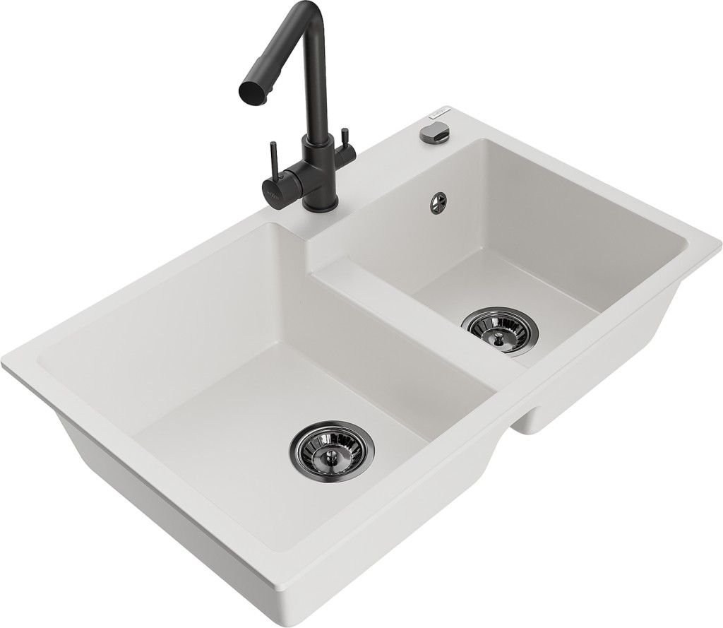 Technické dáta: drez: Rozmer: 800 x 500 x 190 mm Hĺbka komory: 180 mm (väčšia), 180 mm (menšia) Rozmery komory: 440x387 mm (väčšie), 370x303 mm (menšie) Priemer odtoku: ø90 mm Typ: 2-komorový Typ: Zapustené do pracovnej dosky Materiál: žula biela farba Povrchová úprava sifónu: čierna Materiál: žula (80% žulové kamenivo, 20% živice) Prepadový otvor: Áno Otvory: (batérie, automatické) 2 Vysoká odolnosť proti poškriabaniu a zmene farby Odolnosť proti tepelným šokom Ľahko čistiteľný povrch Jeden dodatočný vyfrézovaný otvor na samodierovanie ø35 kuchynská batéria: Materiál: mosadz Čierna farba Hlava: Keramická Prevzdušňovač: Áno Typ: Dve rukoväte Rozsah výtoku: 235 mm Výška batérie: 315 mm Dvojhlavá batéria s prídavným kanálom pre filtrovanú pitnú vodu(GT) Ean: 5905315026200