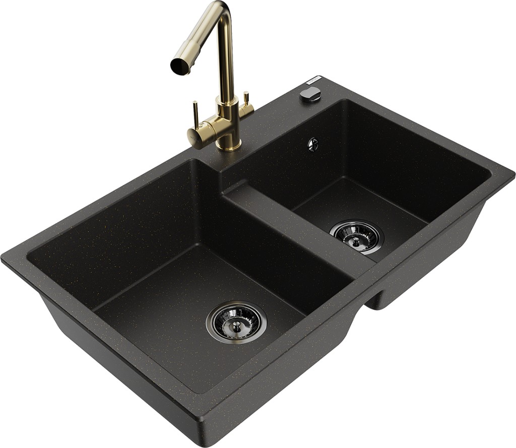Technické dáta: drez: Rozmer: 800 x 500 x 190 mm Hĺbka komory: 180 mm (väčšia), 180 mm (menšia) Rozmery komory: 440x387 mm (väčšie), 370x303 mm (menšie) Priemer odtoku: ø90 mm Typ: 2-komorový Typ: Zapustené do pracovnej dosky Materiál: žula Farba: čierna / zlatá metalíza Povrchová úprava sifónu: čierna Materiál: žula (80% žulové kamenivo, 20% živice) Prepadový otvor: Áno Otvory: (batérie, automatické) 2 Vysoká odolnosť proti poškriabaniu a zmene farby Odolnosť proti tepelným šokom Ľahko čistiteľný povrch Jeden dodatočný vyfrézovaný otvor na samodierovanie ø35 kuchynská batéria: Materiál: mosadz Farba: Zlatá Hlava: Keramická Prevzdušňovač: Áno Typ: Dve rukoväte Rozsah výtoku: 235 mm Výška batérie: 315 mm Dvojhlavá batéria s prídavným kanálom pre filtrovanú pitnú vodu(GT) Ean: 5905315026361