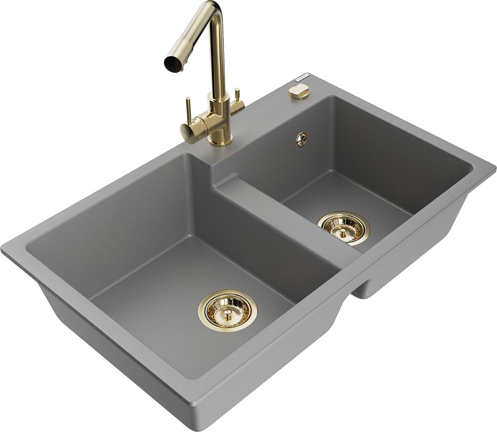 Technické dáta: drez: Rozmer: 800 x 500 x 190 mm Hĺbka komory: 180 mm (väčšia), 180 mm (menšia) Rozmery komory: 440x387 mm (väčšie), 370x303 mm (menšie) Priemer odtoku: ø90 mm Typ: 2-komorový Typ: Zapustené do pracovnej dosky Materiál: žula Šedá farba Povrchová úprava sifónu: zlatá Materiál: žula (80% žulové kamenivo, 20% živice) Prepadový otvor: Áno Otvory: (batérie, automatické) 2 Vysoká odolnosť proti poškriabaniu a zmene farby Odolnosť proti tepelným šokom Ľahko čistiteľný povrch Jeden dodatočný vyfrézovaný otvor na samodierovanie ø35 kuchynská batéria: Materiál: mosadz Farba: Zlatá Hlava: Keramická Prevzdušňovač: Áno Typ: Dve rukoväte Rozsah výtoku: 235 mm Výška batérie: 315 mm Dvojhlavá batéria s prídavným kanálom pre filtrovanú pitnú vodu(GT) Ean: 5905315026262