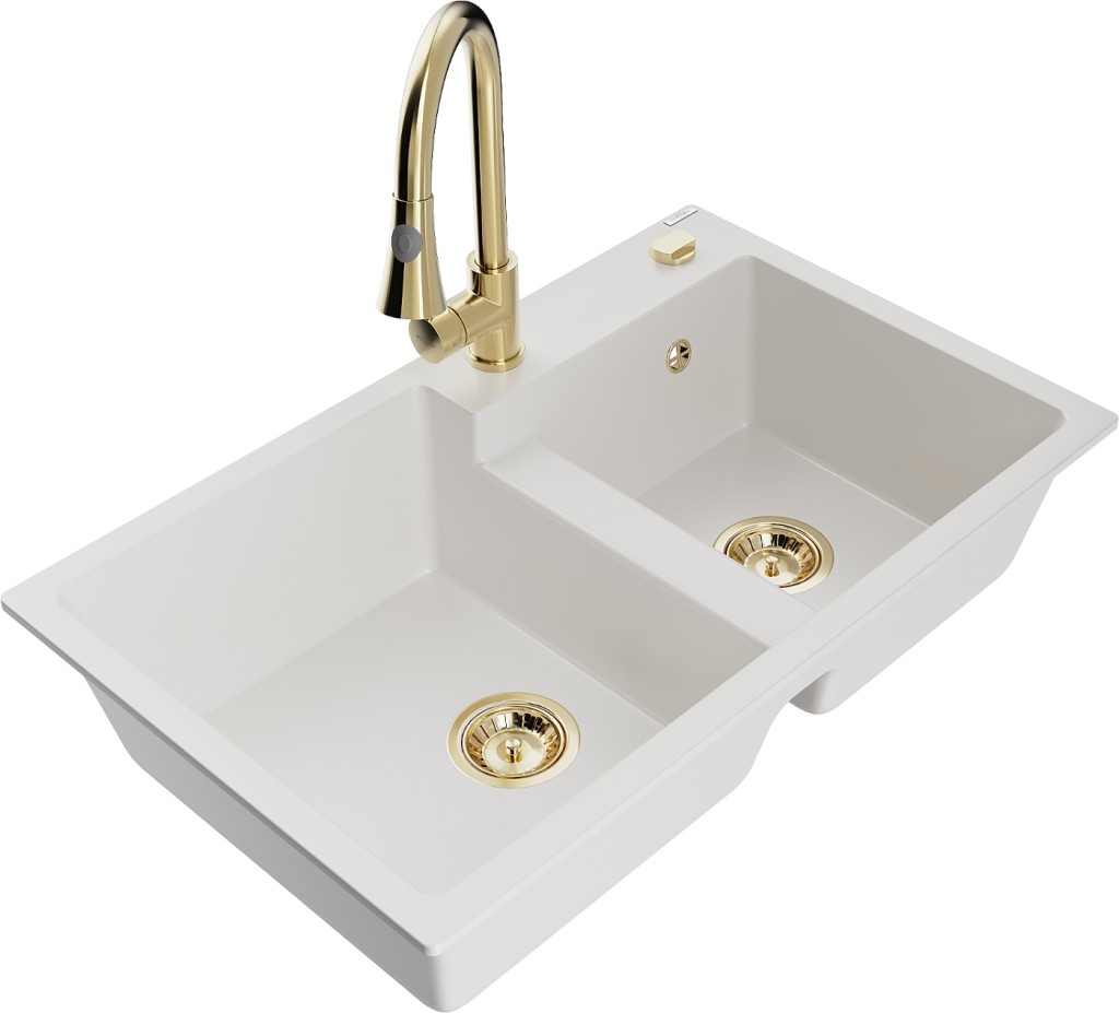 Technické dáta: drez: Rozmer: 800 x 500 x 190 mm Hĺbka komory: 180 mm (väčšia), 180 mm (menšia) Rozmery komory: 440x387 mm (väčšie), 370x303 mm (menšie) Priemer odtoku: ø90 mm Typ: 2-komorový Typ: Zapustené do pracovnej dosky Materiál: žula biela farba Povrchová úprava sifónu: zlatá Materiál: žula (80% žulové kamenivo, 20% živice) Prepadový otvor: Áno Otvory: (batérie, automatické) 2 Vysoká odolnosť proti poškriabaniu a zmene farby Odolnosť proti tepelným šokom Ľahko čistiteľný povrch Jeden dodatočný vyfrézovaný otvor na samodierovanie ø35 kuchynská batéria: Materiál: mosadz Farba: Zlatá Hlava: Keramická Prevzdušňovač: Áno Typ: Jedna páka Výška batérie: 380 mm Rozsah výtoku: 252 mm Typ výtoku: Výsuvný(GT) Ean: 5905315031310