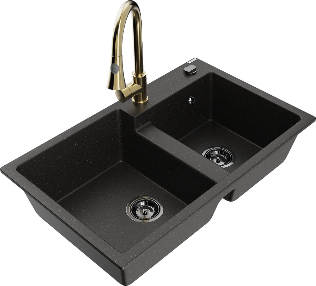 Technické dáta: drez: Rozmer: 800 x 500 x 190 mm Hĺbka komory: 180 mm (väčšia), 180 mm (menšia) Rozmery komory: 440x387 mm (väčšie), 370x303 mm (menšie) Priemer odtoku: ø90 mm Typ: 2-komorový Typ: Zapustené do pracovnej dosky Materiál: žula Farba: čierna / zlatá metalíza Povrchová úprava sifónu: čierna Materiál: žula (80% žulové kamenivo, 20% živice) Prepadový otvor: Áno Otvory: (batérie, automatické) 2 Vysoká odolnosť proti poškriabaniu a zmene farby Odolnosť proti tepelným šokom Ľahko čistiteľný povrch Jeden dodatočný vyfrézovaný otvor na samodierovanie ø35 kuchynská batéria: Materiál: mosadz Farba: Zlatá Hlava: Keramická Prevzdušňovač: Áno Typ: Jedna páka Výška batérie: 380 mm Rozsah výtoku: 252 mm Typ výtoku: Výsuvný(GT) Ean: 5905315031488