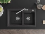 Technické dáta: Drez: Rozmer: 800x500x190 mm Hĺbka komory: 180 mm (väčšia), 180 mm (menšia) Rozmery komory: 440x387 mm (väčšie), 370x303 mm (menšie) Priemer odtoku: ø90 mm Typ: 2-komorový Typ: Zapustené do pracovnej dosky Materiál: žula Farba: Škvrnitá čierna Povrchová úprava sifónu: Chrome Materiál: žula (80% žulové kamenivo 20% živice) Prepadový otvor: Áno Otvory: (batérie, automat) 2 Vysoká odolnosť proti poškriabaniu a zmene farby Odolnosť proti tepelným šokom Povrch pre ľahké čistenie Jeden dodatočný vyfrézovaný otvor na samodierovanie ø35 Kuchynská batéria: Materiál: mosadz Farba: Chrome Hlava: Keramická Perlátor: Áno Typ: Jednopákové Rozsah výtoku: 245 mm Výška batérie: 307 mm(GT) Ean: 5905315062796