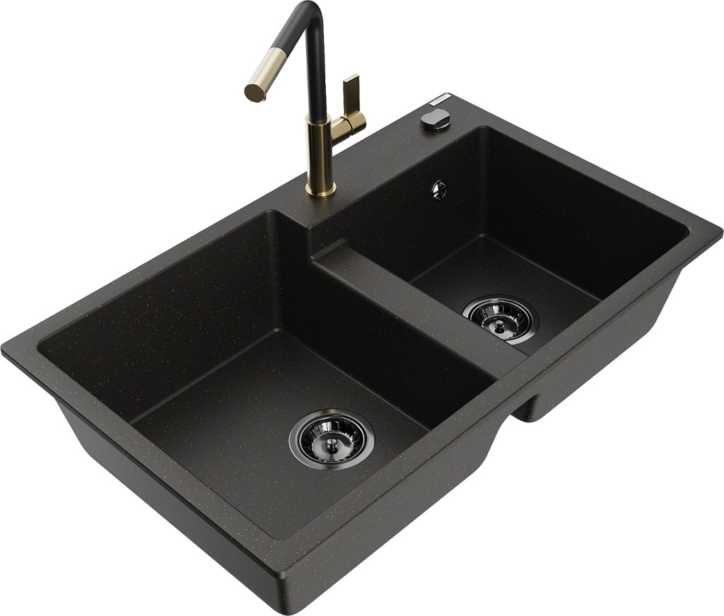 Technické dáta: drez: Rozmer: 800 x 500 x 190 mm Hĺbka komory: 180 mm (väčšia), 180 mm (menšia) Rozmery komory: 440x387 mm (väčšie), 370x303 mm (menšie) Priemer odtoku: ø90 mm Typ: 2-komorový Typ: Zapustené do pracovnej dosky Materiál: žula Farba: čierna / zlatá metalíza Povrchová úprava sifónu: čierna Materiál: žula (80% žulové kamenivo, 20% živice) Prepadový otvor: Áno Otvory: (batérie, automatické) 2 Vysoká odolnosť proti poškriabaniu a zmene farby Odolnosť proti tepelným šokom Ľahko čistiteľný povrch Jeden dodatočný vyfrézovaný otvor na samodierovanie ø35 kuchynská batéria: Materiál: mosadz Farba: Zlatá/Čierna Hlava: Keramická Prevzdušňovač: Áno Typ: Jedna páka Rozsah výtoku: 245 mm Výška batérie: 307 mm(GT) Ean: 5905315062772