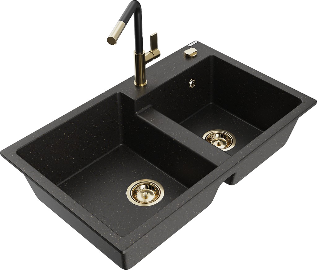 Technické dáta: drez: Rozmer: 800 x 500 x 190 mm Hĺbka komory: 180 mm (väčšia), 180 mm (menšia) Rozmery komory: 440x387 mm (väčšie), 370x303 mm (menšie) Priemer odtoku: ø90 mm Typ: 2-komorový Typ: Zapustené do pracovnej dosky Materiál: žula Farba: čierna / zlatá metalíza Povrchová úprava sifónu: zlatá Materiál: žula (80% žulové kamenivo, 20% živice) Prepadový otvor: Áno Otvory: (batérie, automatické) 2 Vysoká odolnosť proti poškriabaniu a zmene farby Odolnosť proti tepelným šokom Ľahko čistiteľný povrch Jeden dodatočný vyfrézovaný otvor na samodierovanie ø35 kuchynská batéria: Materiál: mosadz Farba: Zlatá/Čierna Hlava: Keramická Prevzdušňovač: Áno Typ: Jedna páka Rozsah výtoku: 245 mm Výška batérie: 307 mm(GT) Ean: 5905315062765