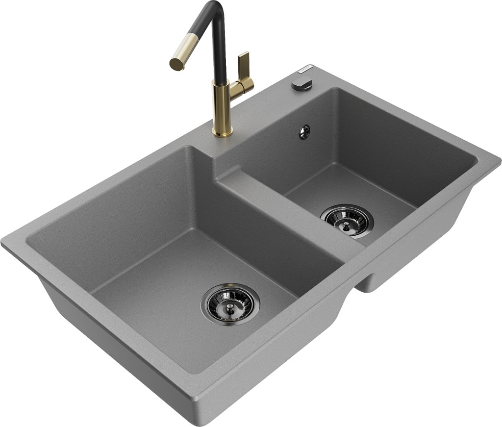 Technické dáta: drez: Rozmer: 800 x 500 x 190 mm Hĺbka komory: 180 mm (väčšia), 180 mm (menšia) Rozmery komory: 440x387 mm (väčšie), 370x303 mm (menšie) Priemer odtoku: ø90 mm Typ: 2-komorový Typ: Zapustené do pracovnej dosky Materiál: žula Šedá farba Povrchová úprava sifónu: čierna Materiál: žula (80% žulové kamenivo, 20% živice) Prepadový otvor: Áno Otvory: (batérie, automatické) 2 Vysoká odolnosť proti poškriabaniu a zmene farby Odolnosť proti tepelným šokom Ľahko čistiteľný povrch Jeden dodatočný vyfrézovaný otvor na samodierovanie ø35 kuchynská batéria: Materiál: mosadz Farba: Zlatá/Čierna Hlava: Keramická Prevzdušňovač: Áno Typ: Jedna páka Rozsah výtoku: 245 mm Výška batérie: 307 mm(GT) Ean: 5905315062659