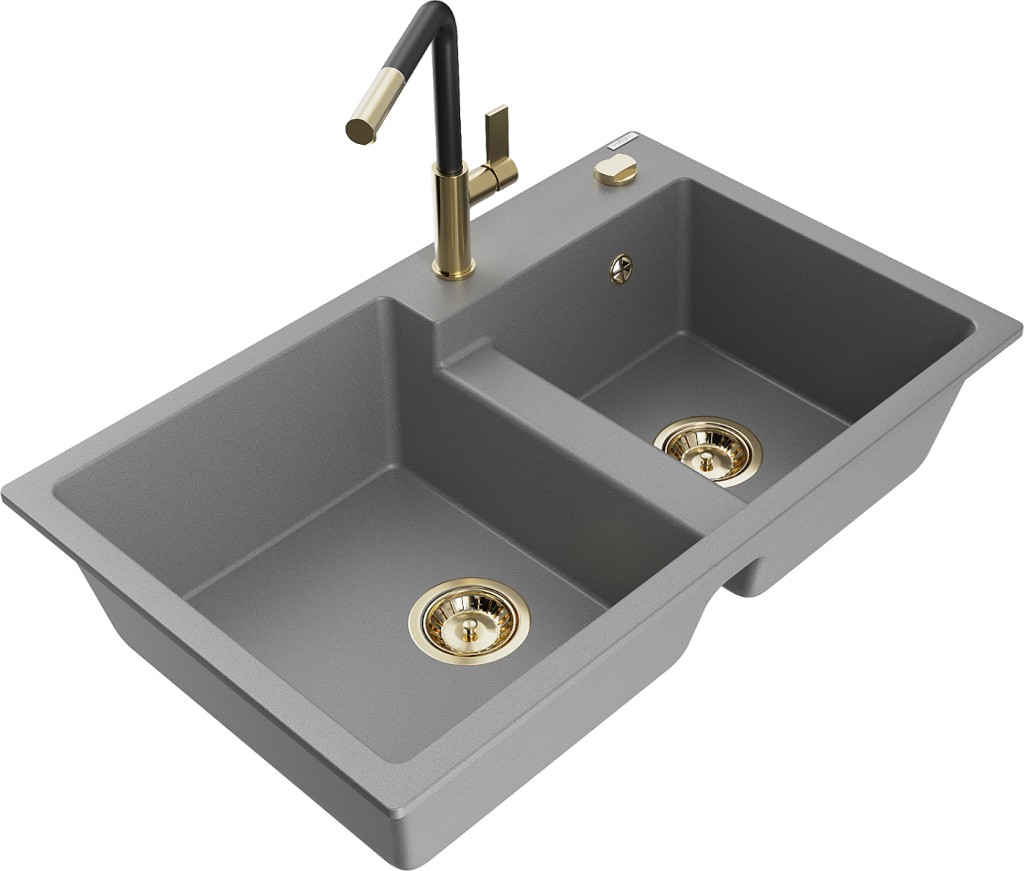 Technické dáta: drez: Rozmer: 800 x 500 x 190 mm Hĺbka komory: 180 mm (väčšia), 180 mm (menšia) Rozmery komory: 440x387 mm (väčšie), 370x303 mm (menšie) Priemer odtoku: ø90 mm Typ: 2-komorový Typ: Zapustené do pracovnej dosky Materiál: žula Šedá farba Povrchová úprava sifónu: zlatá Materiál: žula (80% žulové kamenivo, 20% živice) Prepadový otvor: Áno Otvory: (batérie, automatické) 2 Vysoká odolnosť proti poškriabaniu a zmene farby Odolnosť proti tepelným šokom Ľahko čistiteľný povrch Jeden dodatočný vyfrézovaný otvor na samodierovanie ø35 kuchynská batéria: Materiál: mosadz Farba: Zlatá/Čierna Hlava: Keramická Prevzdušňovač: Áno Typ: Jedna páka Rozsah výtoku: 245 mm Výška batérie: 307 mm(GT) Ean: 5905315062642