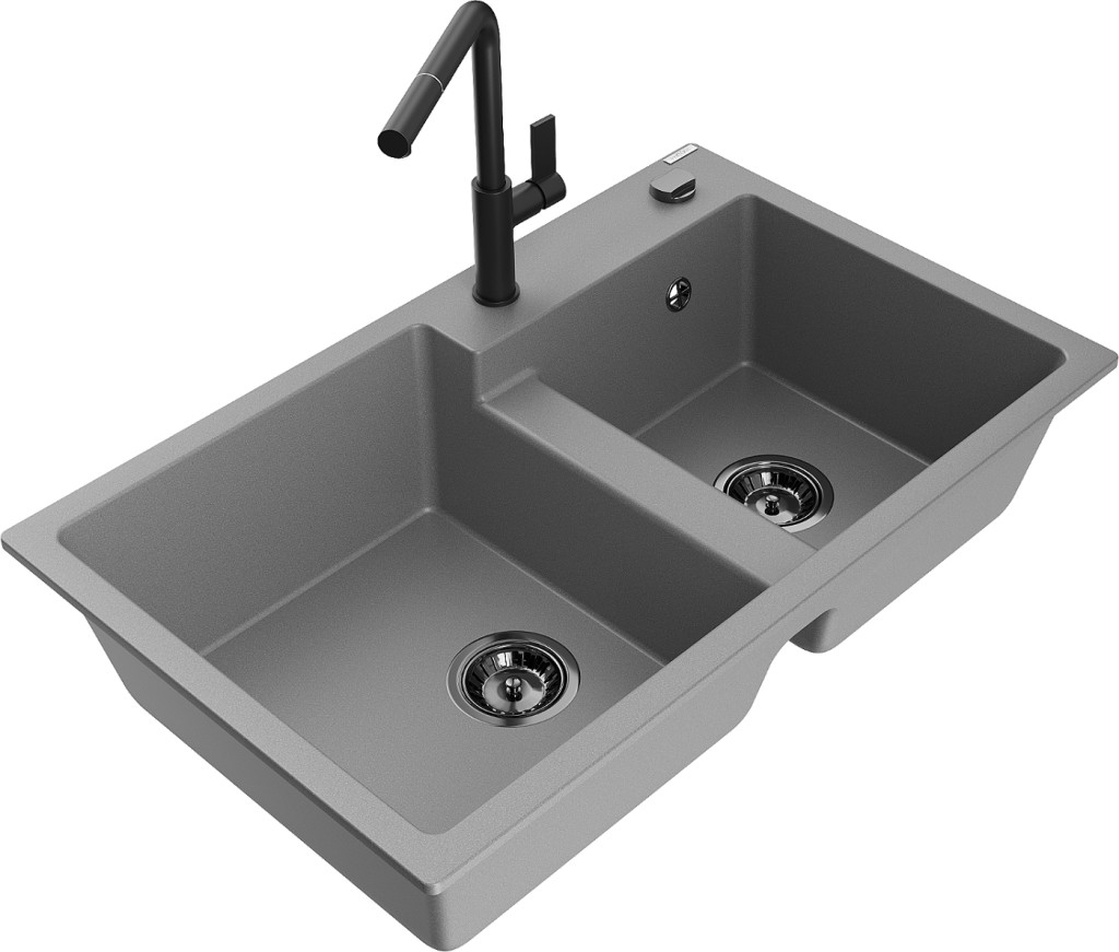 Technické dáta: drez: Rozmer: 800 x 500 x 190 mm Hĺbka komory: 180 mm (väčšia), 180 mm (menšia) Rozmery komory: 440x387 mm (väčšie), 370x303 mm (menšie) Priemer odtoku: ø90 mm Typ: 2-komorový Typ: Zapustené do pracovnej dosky Materiál: žula Šedá farba Povrchová úprava sifónu: čierna Materiál: žula (80% žulové kamenivo, 20% živice) Prepadový otvor: Áno Otvory: (batérie, automatické) 2 Vysoká odolnosť proti poškriabaniu a zmene farby Odolnosť proti tepelným šokom Ľahko čistiteľný povrch Jeden dodatočný vyfrézovaný otvor na samodierovanie ø35 kuchynská batéria: Materiál: mosadz Čierna farba Hlava: Keramická Prevzdušňovač: Áno Typ: Jedna páka Rozsah výtoku: 245 mm Výška batérie: 307 mm(GT) Ean: 5905315062666