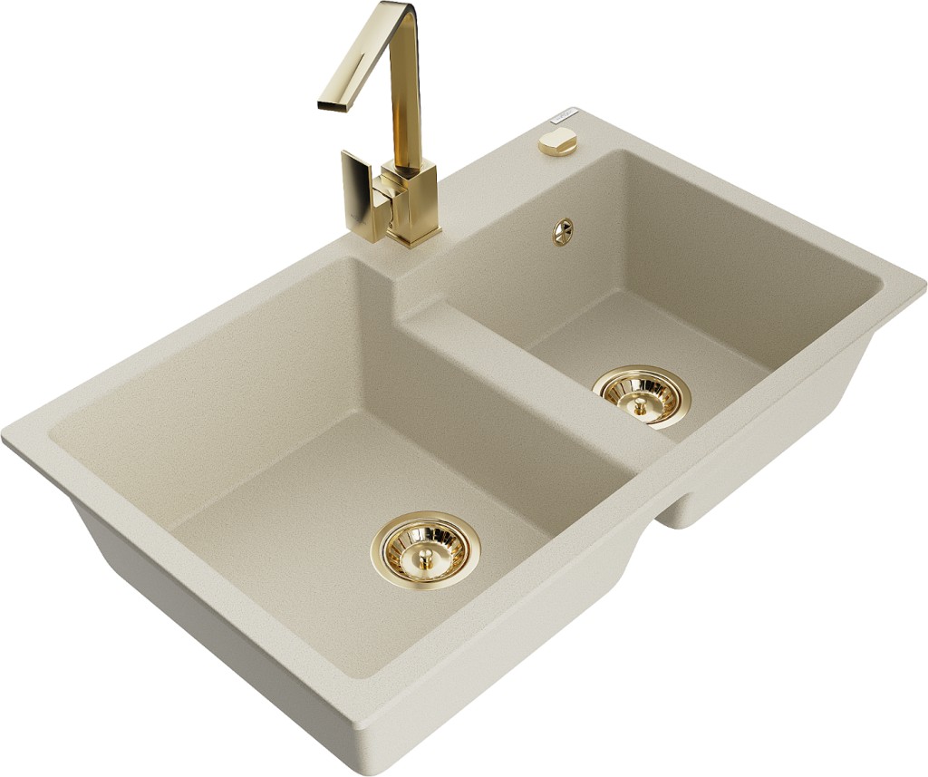 Technické dáta: drez: Rozmer: 800 x 500 x 190 mm Hĺbka komory: 180 mm (väčšia), 180 mm (menšia) Rozmery komory: 440x387 mm (väčšie), 370x303 mm (menšie) Priemer odtoku: ø90 mm Typ: 2-komorový Typ: Zapustené do pracovnej dosky Materiál: žula Farba béžová Povrchová úprava sifónu: zlatá Materiál: žula (80% žulové kamenivo, 20% živice) Prepadový otvor: Áno Otvory: (batérie, automatické) 2 Vysoká odolnosť proti poškriabaniu a zmene farby Odolnosť proti tepelným šokom Ľahko čistiteľný povrch Jeden dodatočný vyfrézovaný otvor na samodierovanie ø35 kuchynská batéria: Materiál: mosadz Farba: Zlatá Hlava: Keramická Prevzdušňovač: Áno Typ: Jedna páka Výška batérie: 290 mm Rozsah výtoku: 220 mm(GT) Ean: 5905315021113