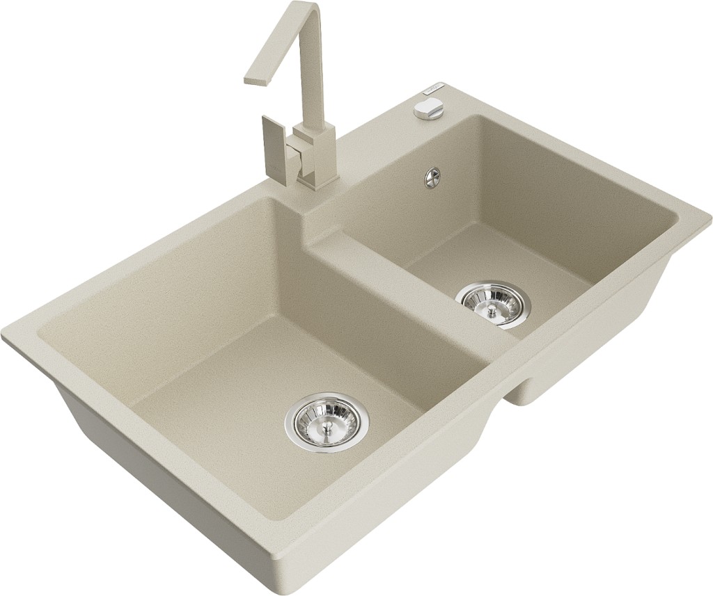 Technické dáta: drez: Rozmer: 800 x 500 x 190 mm Hĺbka komory: 180 mm (väčšia), 180 mm (menšia) Rozmery komory: 440x387 mm (väčšie), 370x303 mm (menšie) Priemer odtoku: ø90 mm Typ: 2-komorový Typ: Zapustené do pracovnej dosky Materiál: žula Farba béžová Povrchová úprava sifónu: Chrome Materiál: žula (80% žulové kamenivo, 20% živice) Prepadový otvor: Áno Otvory: (batérie, automatické) 2 Vysoká odolnosť proti poškriabaniu a zmene farby Odolnosť proti tepelným šokom Ľahko čistiteľný povrch Jeden dodatočný vyfrézovaný otvor na samodierovanie ø35 kuchynská batéria: Materiál: mosadz Farba béžová Hlava: Keramická Prevzdušňovač: Áno Typ: Jedna páka Výška batérie: 290 mm Rozsah výtoku: 220 mm(GT) Ean: 5905315021106