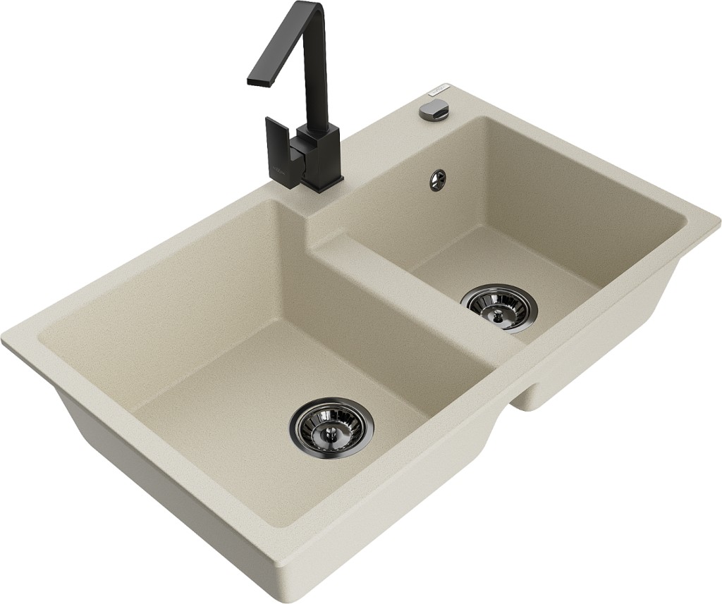 Technické dáta: drez: Rozmer: 800 x 500 x 190 mm Hĺbka komory: 180 mm (väčšia), 180 mm (menšia) Rozmery komory: 440x387 mm (väčšie), 370x303 mm (menšie) Priemer odtoku: ø90 mm Typ: 2-komorový Typ: Zapustené do pracovnej dosky Materiál: žula Farba béžová Povrchová úprava sifónu: čierna Materiál: žula (80% žulové kamenivo, 20% živice) Prepadový otvor: Áno Otvory: (batérie, automatické) 2 Vysoká odolnosť proti poškriabaniu a zmene farby Odolnosť proti tepelným šokom Ľahko čistiteľný povrch Jeden dodatočný vyfrézovaný otvor na samodierovanie ø35 kuchynská batéria: Materiál: mosadz Čierna farba Hlava: Keramická Prevzdušňovač: Áno Typ: Jedna páka Výška batérie: 290 mm Rozsah výtoku: 220 mm(GT) Ean: 5905315021120