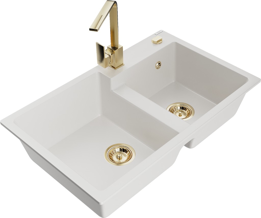 Technické dáta: drez: Rozmer: 800 x 500 x 190 mm Hĺbka komory: 180 mm (väčšia), 180 mm (menšia) Rozmery komory: 440x387 mm (väčšie), 370x303 mm (menšie) Priemer odtoku: ø90 mm Typ: 2-komorový Typ: Zapustené do pracovnej dosky Materiál: žula biela farba Povrchová úprava sifónu: zlatá Materiál: žula (80% žulové kamenivo, 20% živice) Prepadový otvor: Áno Otvory: (batérie, automatické) 2 Vysoká odolnosť proti poškriabaniu a zmene farby Odolnosť proti tepelným šokom Ľahko čistiteľný povrch Jeden dodatočný vyfrézovaný otvor na samodierovanie ø35 kuchynská batéria: Materiál: mosadz Farba: Zlatá Hlava: Keramická Prevzdušňovač: Áno Typ: Jedna páka Výška batérie: 290 mm Rozsah výtoku: 220 mm(GT) Ean: 5905315021076