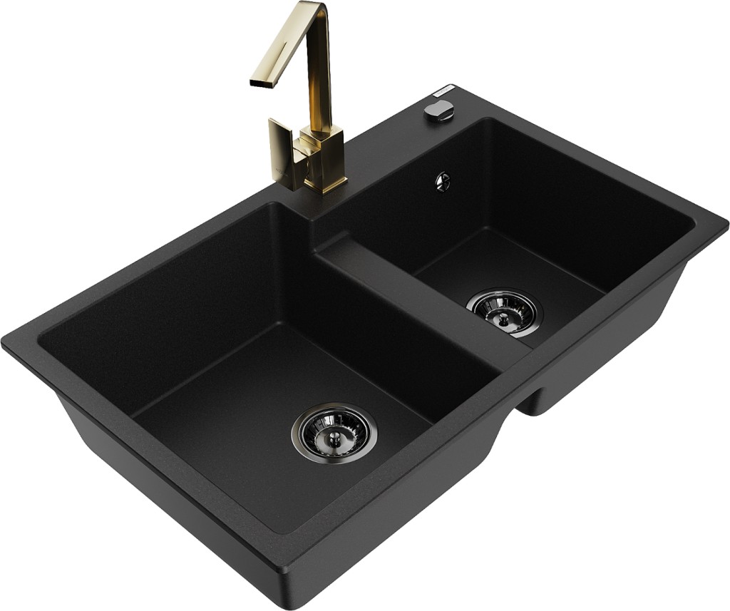 Technické dáta: drez: Rozmer: 800 x 500 x 190 mm Hĺbka komory: 180 mm (väčšia), 180 mm (menšia) Rozmery komory: 440x387 mm (väčšie), 370x303 mm (menšie) Priemer odtoku: ø90 mm Typ: 2-komorový Typ: Zapustené do pracovnej dosky Materiál: žula Čierna farba Povrchová úprava sifónu: čierna Materiál: žula (80% žulové kamenivo, 20% živice) Prepadový otvor: Áno Otvory: (batérie, automatické) 2 Vysoká odolnosť proti poškriabaniu a zmene farby Odolnosť proti tepelným šokom Ľahko čistiteľný povrch Jeden dodatočný vyfrézovaný otvor na samodierovanie ø35 kuchynská batéria: Materiál: mosadz Farba: Zlatá Hlava: Keramická Prevzdušňovač: Áno Typ: Jedna páka Výška batérie: 290 mm Rozsah výtoku: 220 mm (GT) Ean: 5905315021342
