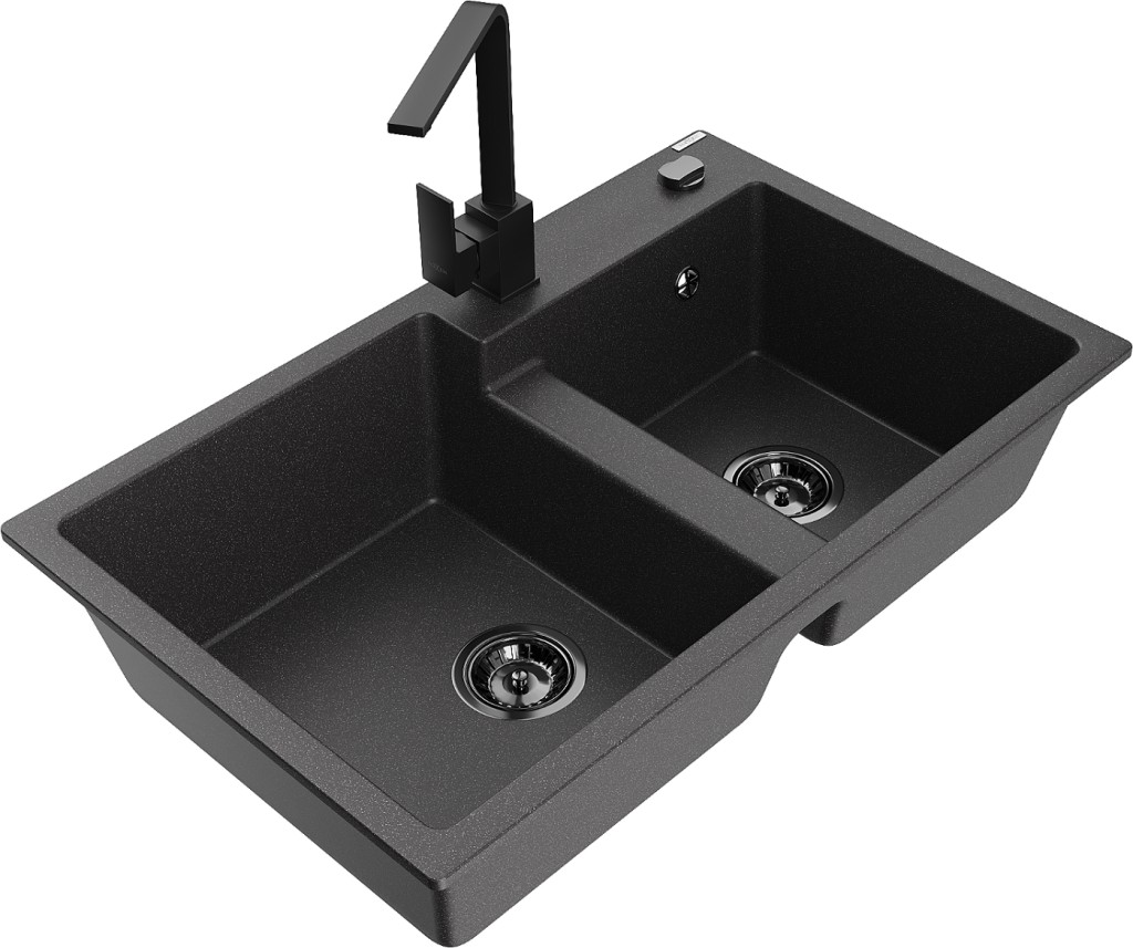 Technické dáta: drez: Rozmer: 800 x 500 x 190 mm Hĺbka komory: 180 mm (väčšia), 180 mm (menšia) Rozmery komory: 440x387 mm (väčšie), 370x303 mm (menšie) Priemer odtoku: ø90 mm Typ: 2-komorový Typ: Zapustené do pracovnej dosky Materiál: žula Farba: Škvrnitá čierna Povrchová úprava sifónu: čierna Materiál: žula (80% žulové kamenivo, 20% živice) Prepadový otvor: Áno Otvory: (batérie, automatické) 2 Vysoká odolnosť proti poškriabaniu a zmene farby Odolnosť proti tepelným šokom Ľahko čistiteľný povrch Jeden dodatočný vyfrézovaný otvor na samodierovanie ø35 kuchynská batéria: Materiál: mosadz Čierna farba Hlava: Keramická Prevzdušňovač: Áno Typ: Jedna páka Výška batérie: 290 mm Rozsah výtoku: 220 mm(GT) Ean: 5905315021304