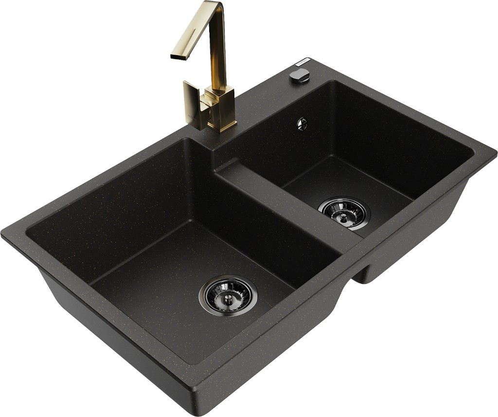 Technické dáta: drez: Rozmer: 800 x 500 x 190 mm Hĺbka komory: 180 mm (väčšia), 180 mm (menšia) Rozmery komory: 440x387 mm (väčšie), 370x303 mm (menšie) Priemer odtoku: ø90 mm Typ: 2-komorový Typ: Zapustené do pracovnej dosky Materiál: žula Farba: čierna / zlatá metalíza Povrchová úprava sifónu: čierna Materiál: žula (80% žulové kamenivo, 20% živice) Prepadový otvor: Áno Otvory: (batérie, automatické) 2 Vysoká odolnosť proti poškriabaniu a zmene farby Odolnosť proti tepelným šokom Ľahko čistiteľný povrch Jeden dodatočný vyfrézovaný otvor na samodierovanie ø35 kuchynská batéria: Materiál: mosadz Farba: Zlatá Hlava: Keramická Prevzdušňovač: Áno Typ: Jedna páka Výška batérie: 290 mm Rozsah výtoku: 220 mm(GT) Ean: 5905315021243