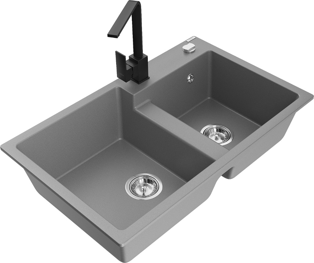 Technické dáta: drez: Rozmer: 800 x 500 x 190 mm Hĺbka komory: 180 mm (väčšia), 180 mm (menšia) Rozmery komory: 440x387 mm (väčšie), 370x303 mm (menšie) Priemer odtoku: ø90 mm Typ: 2-komorový Typ: Zapustené do pracovnej dosky Materiál: žula Šedá farba Povrchová úprava sifónu: Chrome Materiál: žula (80% žulové kamenivo, 20% živice) Prepadový otvor: Áno Otvory: (batérie, automatické) 2 Vysoká odolnosť proti poškriabaniu a zmene farby Odolnosť proti tepelným šokom Ľahko čistiteľný povrch Jeden dodatočný vyfrézovaný otvor na samodierovanie ø35 kuchynská batéria: Materiál: mosadz Čierna farba Hlava: Keramická Prevzdušňovač: Áno Typ: Jedna páka Výška batérie: 290 mm Rozsah výtoku: 220 mm(GT) Ean: 5905315021151