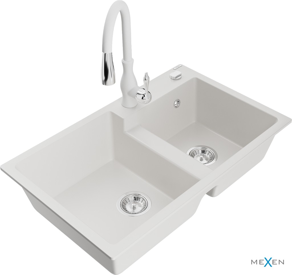 Technické dáta: drez: Rozmer: 800 x 500 x 190 mm Hĺbka komory: 180 mm (väčšia), 180 mm (menšia) Rozmery komory: 440x387 mm (väčšie), 370x303 mm (menšie) Priemer odtoku: ø90 mm Typ: 2-komorový Typ: Zapustené do pracovnej dosky biela farba Povrchová úprava sifónu: Chrome Materiál: žula (80% žulové kamenivo, 20% živice) Prepadový otvor: Áno Otvory: (batérie, automatické) 2 Vysoká odolnosť proti poškriabaniu a zmene farby Odolnosť proti tepelným šokom Ľahko čistiteľný povrch Jeden dodatočný vyfrézovaný otvor na samodierovanie ø35 kuchynská batéria: Materiál: mosadz biela farba Hlava: Keramická Prevzdušňovač: Áno Typ: Jedna páka Výška batérie: 410 mm Rozsah výtoku: 231 mm(GT) Ean: 5905315036414