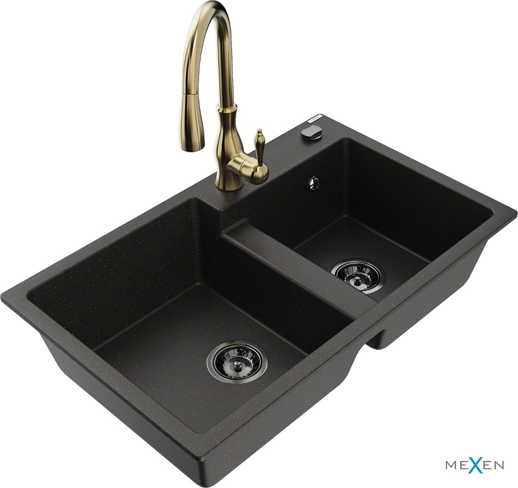 Technické dáta: drez: Rozmer: 800 x 500 x 190 mm Hĺbka komory: 180 mm (väčšia), 180 mm (menšia) Rozmery komory: 440x387 mm (väčšie), 370x303 mm (menšie) Priemer odtoku: ø90 mm Typ: 2-komorový Typ: Zapustené do pracovnej dosky Farba: čierna / zlatá metalíza Povrchová úprava sifónu: čierna Materiál: žula (80% žulové kamenivo, 20% živice) Prepadový otvor: Áno Otvory: (batérie, automatické) 2 Vysoká odolnosť proti poškriabaniu a zmene farby Odolnosť proti tepelným šokom Ľahko čistiteľný povrch Jeden dodatočný vyfrézovaný otvor na samodierovanie ø35 kuchynská batéria: Materiál: mosadz Farba: Zlatá Hlava: Keramická Prevzdušňovač: Áno Typ: Jedna páka Výška batérie: 410 mm Rozsah výtoku: 231 mm(GT) Ean: 5905315036599