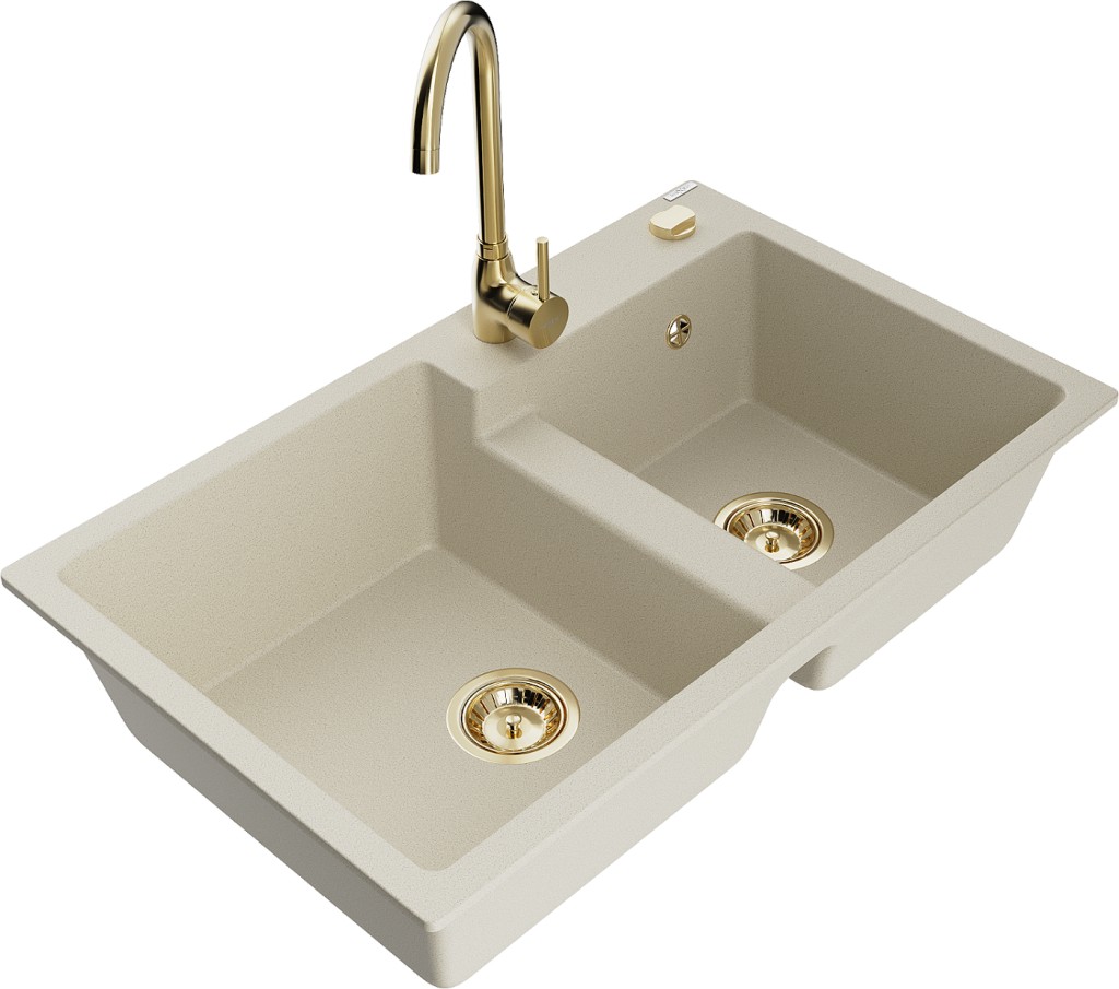 Technické dáta: drez: Rozmer: 800 x 500 x 190 mm Hĺbka komory: 180 mm (väčšia), 180 mm (menšia) Rozmery komory: 440x387 mm (väčšie), 370x303 mm (menšie) Priemer odtoku: ø90 mm Typ: 2-komorový Typ: Zapustené do pracovnej dosky Farba béžová Povrchová úprava sifónu: zlatá Materiál: žula (80% žulové kamenivo, 20% živice) Prepadový otvor: Áno Otvory: (batérie, automatické) 2 Vysoká odolnosť proti poškriabaniu a zmene farby Odolnosť proti tepelným šokom Ľahko čistiteľný povrch Jeden dodatočný vyfrézovaný otvor na samodierovanie ø35 kuchynská batéria: Materiál: mosadz Farba: Zlatá Hlava: Keramická Prevzdušňovač: Áno Typ: Jedna páka Výška batérie: 335 mm Rozsah výtoku: 180 mm(GT) Ean: 5905315015990