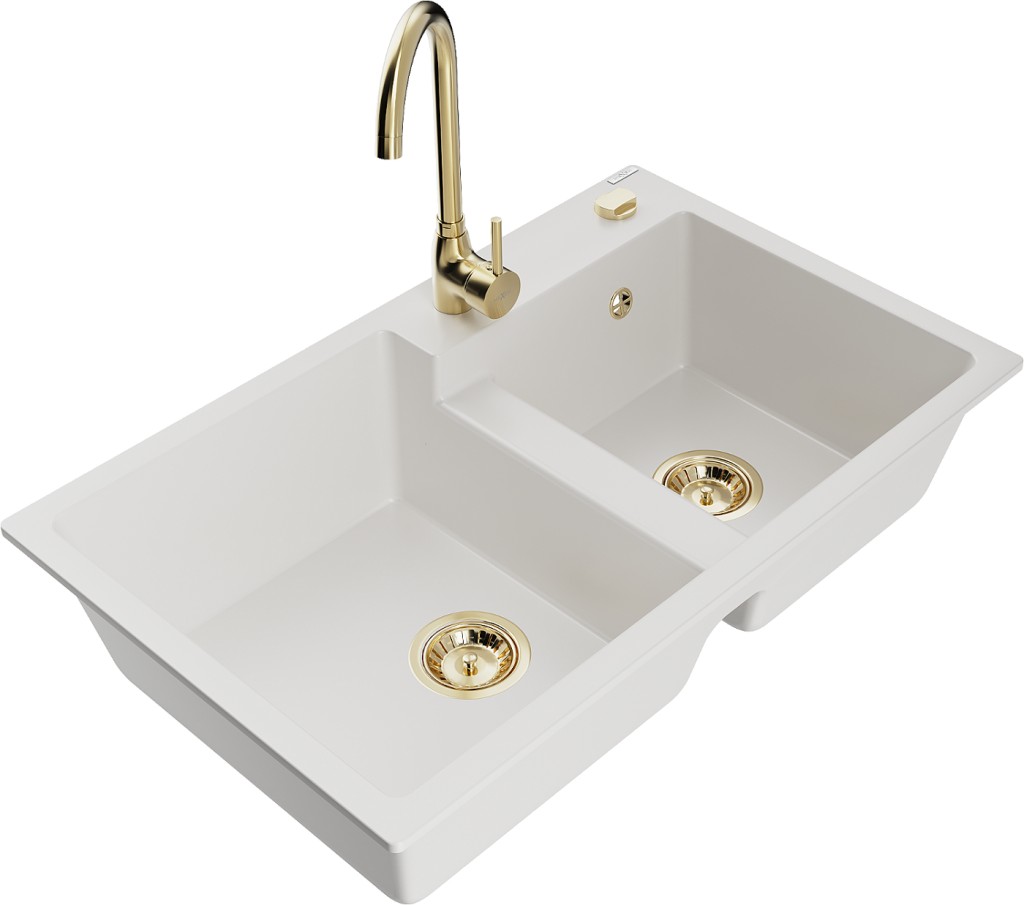 Technické dáta: drez: Rozmer: 800 x 500 x 190 mm Hĺbka komory: 180 mm (väčšia), 180 mm (menšia) Rozmery komory: 440x387 mm (väčšie), 370x303 mm (menšie) Priemer odtoku: ø90 mm Typ: 2-komorový Typ: Zapustené do pracovnej dosky biela farba Povrchová úprava sifónu: zlatá Materiál: žula (80% žulové kamenivo, 20% živice) Prepadový otvor: Áno Otvory: (batérie, automatické) 2 Vysoká odolnosť proti poškriabaniu a zmene farby Odolnosť proti tepelným šokom Ľahko čistiteľný povrch Jeden dodatočný vyfrézovaný otvor na samodierovanie ø35 kuchynská batéria: Materiál: mosadz Farba: Zlatá Hlava: Keramická Prevzdušňovač: Áno Typ: Jedna páka Výška batérie: 335 mm Rozsah výtoku: 180 mm(GT) Ean: 5905315015952