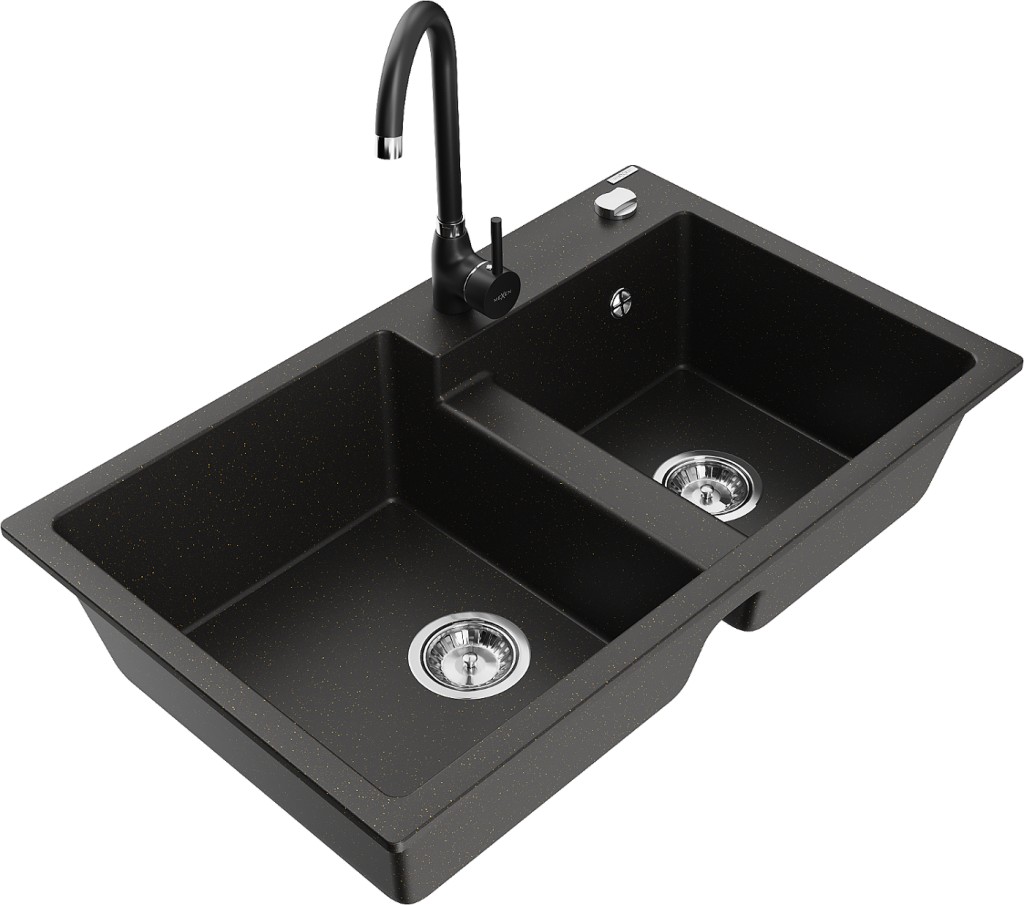 Technické dáta: drez: Rozmer: 800 x 500 x 190 mm Hĺbka komory: 180 mm (väčšia), 180 mm (menšia) Rozmery komory: 440x387 mm (väčšie), 370x303 mm (menšie) Priemer odtoku: ø90 mm Typ: 2-komorový Typ: Zapustené do pracovnej dosky Farba: čierna / zlatá metalíza Povrchová úprava sifónu: Chrome Materiál: žula (80% žulové kamenivo, 20% živice) Prepadový otvor: Áno Otvory: (batérie, automatické) 2 Vysoká odolnosť proti poškriabaniu a zmene farby Odolnosť proti tepelným šokom Ľahko čistiteľný povrch Jeden dodatočný vyfrézovaný otvor na samodierovanie ø35 kuchynská batéria: Materiál: mosadz Čierna farba Hlava: Keramická Prevzdušňovač: Áno Typ: Jedna páka Výška batérie: 335 mm Rozsah výtoku: 180 mm(GT) Ean: 5905315016133