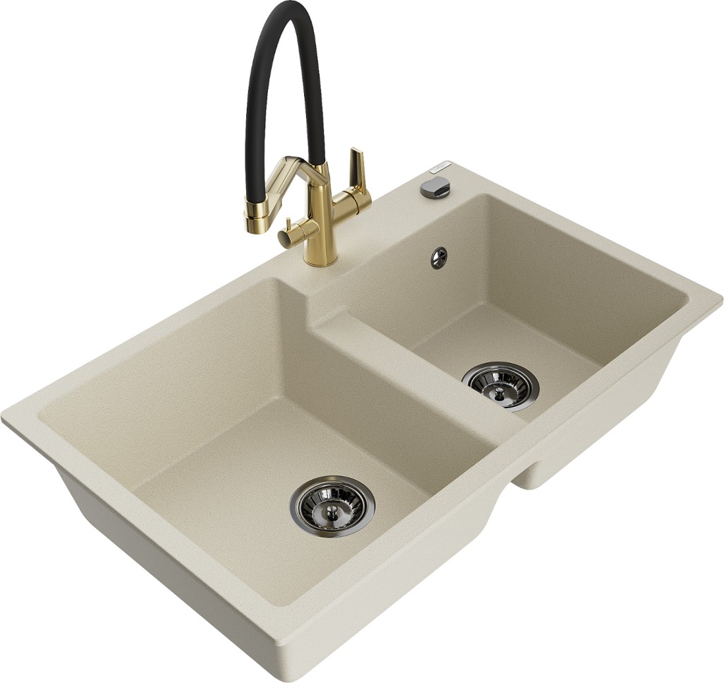 Technické dáta: drez: Rozmer: 800 x 500 x 190 mm Hĺbka komory: 180 mm (väčšia), 180 mm (menšia) Rozmery komory: 440x387 mm (väčšie), 370x303 mm (menšie) Priemer odtoku: ø90 mm Typ: 2-komorový Typ: Zapustené do pracovnej dosky Materiál: žula Farba béžová Povrchová úprava sifónu: čierna Materiál: žula (80% žulové kamenivo, 20% živice) Prepadový otvor: Áno Otvory: (batérie, automatické) 2 Vysoká odolnosť proti poškriabaniu a zmene farby Odolnosť proti tepelným šokom Ľahko čistiteľný povrch Jeden dodatočný vyfrézovaný otvor na samodierovanie ø35 kuchynská batéria: Materiál: mosadz Farba: Zlatá/Čierna Hlavy: Keramické Prevzdušňovač: Áno Typ hubica: Flexibilný s mosadzným držiakom Rozsah výtoku: 260 mm Výška: 405 mm Typ: Dve rukoväte Dvojhlavá batéria s prídavným filtrom na pitnú vodu(GT) Ean: 5905315054791