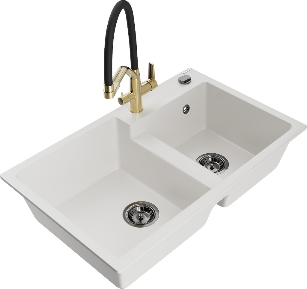 Technické dáta: drez: Rozmer: 800 x 500 x 190 mm Hĺbka komory: 180 mm (väčšia), 180 mm (menšia) Rozmery komory: 440x387 mm (väčšie), 370x303 mm (menšie) Priemer odtoku: ø90 mm Typ: 2-komorový Typ: Zapustené do pracovnej dosky Materiál: žula biela farba Povrchová úprava sifónu: čierna Materiál: žula (80% žulové kamenivo, 20% živice) Prepadový otvor: Áno Otvory: (batérie, automatické) 2 Vysoká odolnosť proti poškriabaniu a zmene farby Odolnosť proti tepelným šokom Ľahko čistiteľný povrch Jeden dodatočný vyfrézovaný otvor na samodierovanie ø35 kuchynská batéria: Materiál: mosadz Farba: Zlatá/Čierna Hlavy: Keramické Prevzdušňovač: Áno Typ hubica: Flexibilný s mosadzným držiakom Rozsah výtoku: 260 mm Výška: 405 mm Typ: Dve rukoväte Dvojhlavá batéria s prídavným filtrom na pitnú vodu(GT) Ean: 5905315054739