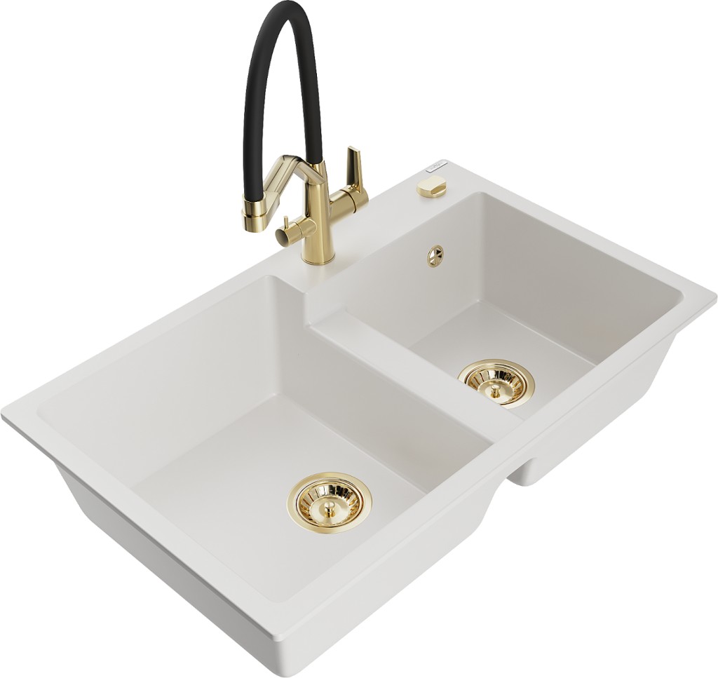 Technické dáta: drez: Rozmer: 800 x 500 x 190 mm Hĺbka komory: 180 mm (väčšia), 180 mm (menšia) Rozmery komory: 440x387 mm (väčšie), 370x303 mm (menšie) Priemer odtoku: ø90 mm Typ: 2-komorový Typ: Zapustené do pracovnej dosky Materiál: žula biela farba Povrchová úprava sifónu: zlatá Materiál: žula (80% žulové kamenivo, 20% živice) Prepadový otvor: Áno Otvory: (batérie, automatické) 2 Vysoká odolnosť proti poškriabaniu a zmene farby Odolnosť proti tepelným šokom Ľahko čistiteľný povrch Jeden dodatočný vyfrézovaný otvor na samodierovanie ø35 kuchynská batéria: Materiál: mosadz Farba: Zlatá/Čierna Hlavy: Keramické Prevzdušňovač: Áno Typ hubica: Flexibilný s mosadzným držiakom Rozsah výtoku: 260 mm Výška: 405 mm Typ: Dve rukoväte Dvojhlavá batéria s prídavným filtrom na pitnú vodu(GT) Ean: 5905315054722