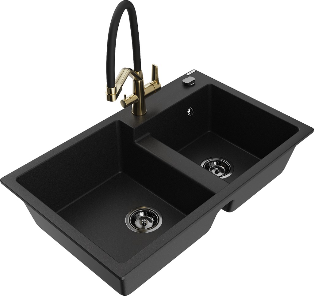 Technické dáta: drez: Rozmer: 800 x 500 x 190 mm Hĺbka komory: 180 mm (väčšia), 180 mm (menšia) Rozmery komory: 440x387 mm (väčšie), 370x303 mm (menšie) Priemer odtoku: ø90 mm Typ: 2-komorový Typ: Zapustené do pracovnej dosky Materiál: žula Čierna farba Povrchová úprava sifónu: čierna Materiál: žula (80% žulové kamenivo, 20% živice) Prepadový otvor: Áno Otvory: (batérie, automatické) 2 Vysoká odolnosť proti poškriabaniu a zmene farby Odolnosť proti tepelným šokom Ľahko čistiteľný povrch Jeden dodatočný vyfrézovaný otvor na samodierovanie ø35 kuchynská batéria: Materiál: mosadz Farba: Zlatá/Čierna Hlavy: Keramické Prevzdušňovač: Áno Typ hubica: Flexibilný s mosadzným držiakom Rozsah výtoku: 260 mm Výška: 405 mm Typ: Dve rukoväte Dvojhlavá batéria s prídavným filtrom na pitnú vodu(GT) Ean: 5905315055095