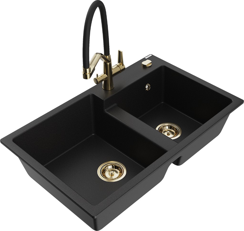 Technické dáta: drez: Rozmer: 800 x 500 x 190 mm Hĺbka komory: 180 mm (väčšia), 180 mm (menšia) Rozmery komory: 440x387 mm (väčšie), 370x303 mm (menšie) Priemer odtoku: ø90 mm Typ: 2-komorový Typ: Zapustené do pracovnej dosky Materiál: žula Čierna farba Povrchová úprava sifónu: zlatá Materiál: žula (80% žulové kamenivo, 20% živice) Prepadový otvor: Áno Otvory: (batérie, automatické) 2 Vysoká odolnosť proti poškriabaniu a zmene farby Odolnosť proti tepelným šokom Ľahko čistiteľný povrch Jeden dodatočný vyfrézovaný otvor na samodierovanie ø35 kuchynská batéria: Materiál: mosadz Farba: Zlatá/Čierna Hlavy: Keramické Prevzdušňovač: Áno Typ hubica: Flexibilný s mosadzným držiakom Rozsah výtoku: 260 mm Výška: 405 mm Typ: Dve rukoväte Dvojhlavá batéria s prídavným filtrom na pitnú vodu(GT) Ean: 5905315055088