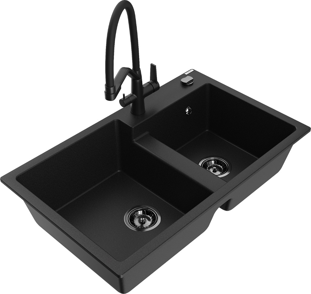 Technické dáta: drez: Rozmer: 800 x 500 x 190 mm Hĺbka komory: 180 mm (väčšia), 180 mm (menšia) Rozmery komory: 440x387 mm (väčšie), 370x303 mm (menšie) Priemer odtoku: ø90 mm Typ: 2-komorový Typ: Zapustené do pracovnej dosky Materiál: žula Čierna farba Povrchová úprava sifónu: čierna Materiál: žula (80% žulové kamenivo, 20% živice) Prepadový otvor: Áno Otvory: (batérie, automatické) 2 Vysoká odolnosť proti poškriabaniu a zmene farby Odolnosť proti tepelným šokom Ľahko čistiteľný povrch Jeden dodatočný vyfrézovaný otvor na samodierovanie ø35 kuchynská batéria: Materiál: mosadz Čierna farba Hlavy: Keramické Prevzdušňovač: Áno Typ hubica: Flexibilný s mosadzným držiakom Rozsah výtoku: 260 mm Výška: 405 mm Typ: Dve rukoväte Dvojhlavá batéria s prídavným filtrom na pitnú vodu (GT) Ean: 5905315055101