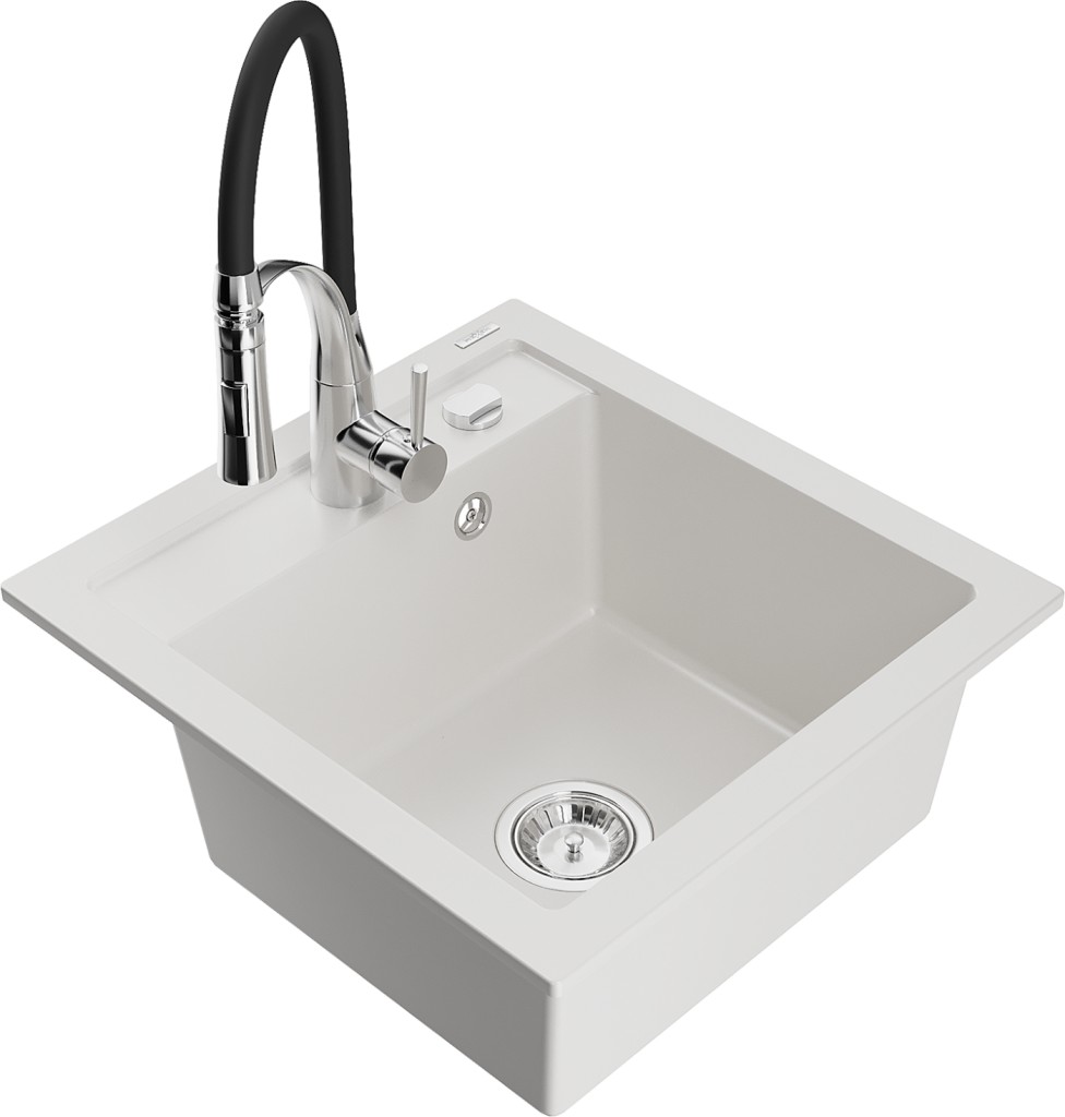 Technické dáta: drez: Rozmer: 520 x 490 x 210 mm Hĺbka komory: 200 mm Rozmery komory: 410x360 mm Priemer odtoku: ø90 mm Typ: 1-komorový Typ: Zapustené do pracovnej dosky biela farba Povrchová úprava sifónu: Chrome Materiál: žula (80% žulové kamenivo, 20% živice) Prepadový otvor: Áno Otvory: (batérie, automatické) 2 Vysoká odolnosť proti poškriabaniu a zmene farby Odolnosť proti tepelným šokom Ľahko čistiteľný povrch Jeden dodatočný vyfrézovaný otvor na samodierovanie ø35 kuchynská batéria: Materiál: mosadz Farba: chróm/čierna Hlava: Keramická Prevzdušňovač: Áno Typ: Jedna páka Výška batérie: 430 mm Rozsah výtoku: 185 mm Batéria má výsuvný výtok(GT) Ean: 5905315043368