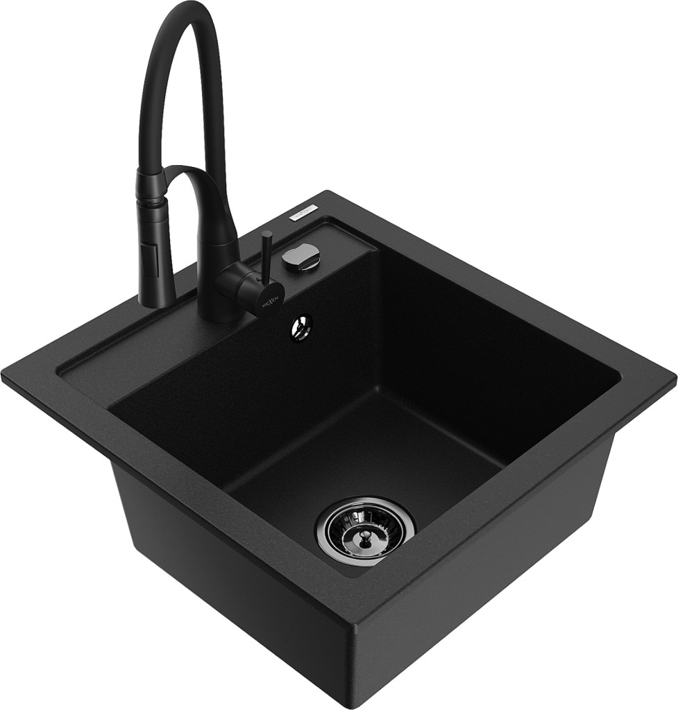 Technické dáta: drez: Rozmer: 520 x 490 x 210 mm Hĺbka komory: 200 mm Rozmery komory: 410x360 mm Priemer odtoku: ø90 mm Typ: 1-komorový Typ: Zapustené do pracovnej dosky Čierna farba Povrchová úprava sifónu: čierna Materiál: žula (80% žulové kamenivo, 20% živice) Prepadový otvor: Áno Otvory: (batérie, automatické) 2 Vysoká odolnosť proti poškriabaniu a zmene farby Odolnosť proti tepelným šokom Ľahko čistiteľný povrch Jeden dodatočný vyfrézovaný otvor na samodierovanie ø35 kuchynská batéria: Materiál: mosadz Čierna farba Hlava: Keramická Prevzdušňovač: Áno Typ: Jedna páka Výška batérie: 430 mm Rozsah výtoku: 185 mm Batéria má výsuvný výtok(GT) Ean: 5905315043764