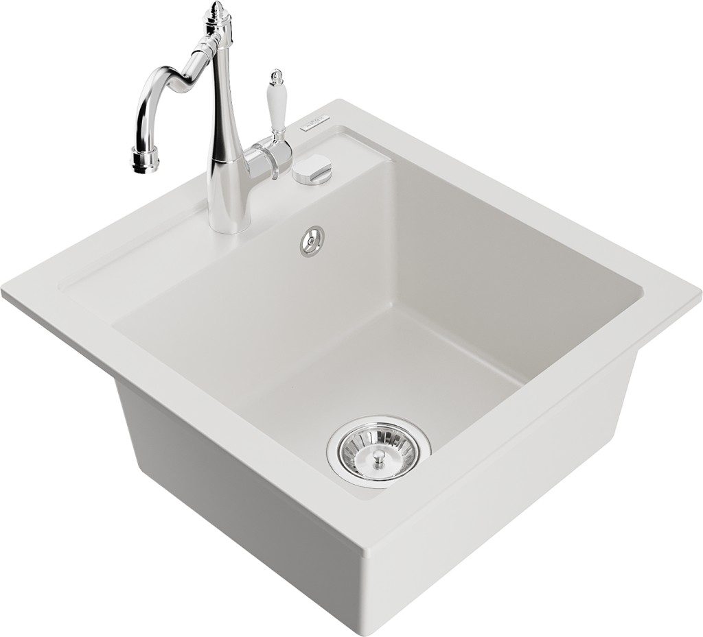 Technické dáta: drez: Rozmer: 520 x 490 x 210 mm Hĺbka komory: 200 mm Rozmery komory: 410x360 mm Priemer odtoku: ø90 mm Typ: 1-komorový Typ: Zapustené do pracovnej dosky biela farba Povrchová úprava sifónu: Chrome Materiál: žula (80% žulové kamenivo, 20% živice) Prepadový otvor: Áno Otvory: (batérie, automatické) 2 Vysoká odolnosť proti poškriabaniu a zmene farby Odolnosť proti tepelným šokom Ľahko čistiteľný povrch Jeden dodatočný vyfrézovaný otvor na samodierovanie ø35 kuchynská batéria: Materiál: mosadz Farba: Chrome Hlava: Keramická Prevzdušňovač: Áno Typ: Jedna páka Výška batérie: 290 mm Rozsah výtoku: 260 mm (GT) Ean: 5905315038029