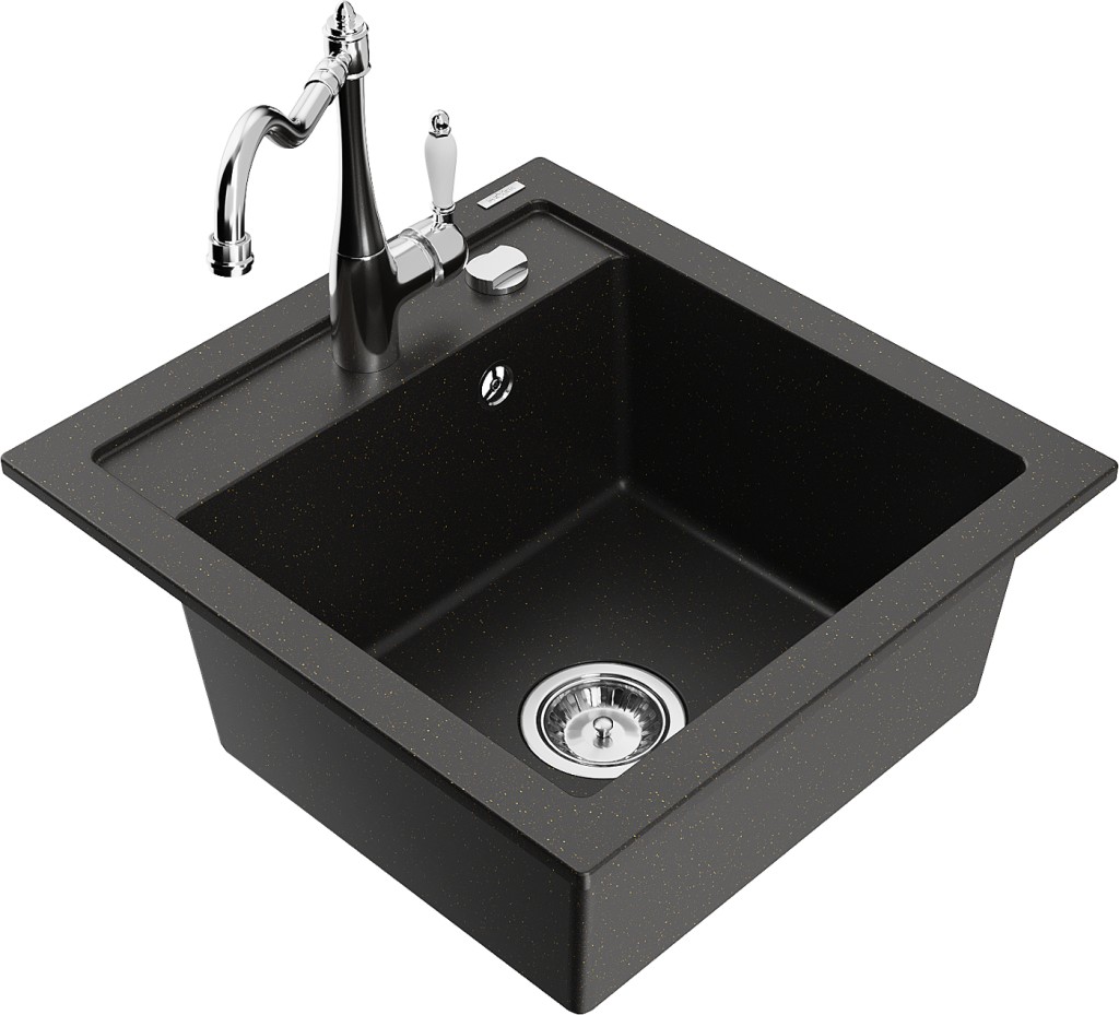 Technické dáta: drez: Rozmer: 520 x 490 x 210 mm Hĺbka komory: 200 mm Rozmery komory: 410x360 mm Priemer odtoku: ø90 mm Typ: 1-komorový Typ: Zapustené do pracovnej dosky Farba: čierna / zlatá metalíza Povrchová úprava sifónu: Chrome Materiál: žula (80% žulové kamenivo, 20% živice) Prepadový otvor: Áno Otvory: (batérie, automatické) 2 Vysoká odolnosť proti poškriabaniu a zmene farby Odolnosť proti tepelným šokom Ľahko čistiteľný povrch Jeden dodatočný vyfrézovaný otvor na samodierovanie ø35 kuchynská batéria: Materiál: mosadz Farba: Chrome Hlava: Keramická Prevzdušňovač: Áno Typ: Jedna páka Výška batérie: 290 mm Rozsah výtoku: 260 mm(GT) Ean: 5905315038203
