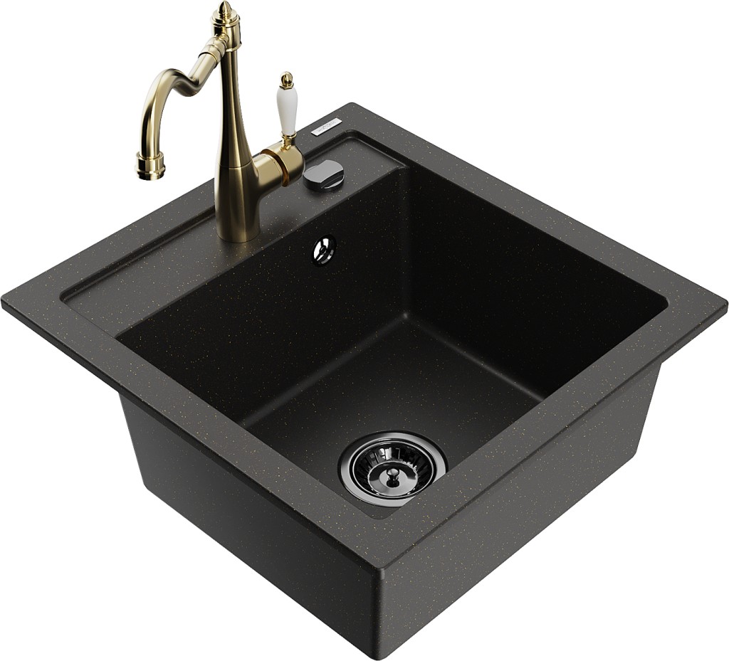 Technické dáta: drez: Rozmer: 520 x 490 x 210 mm Hĺbka komory: 200 mm Rozmery komory: 410x360 mm Priemer odtoku: ø90 mm Typ: 1-komorový Typ: Zapustené do pracovnej dosky Farba: čierna / zlatá metalíza Povrchová úprava sifónu: čierna Materiál: žula (80% žulové kamenivo, 20% živice) Prepadový otvor: Áno Otvory: (batérie, automatické) 2 Vysoká odolnosť proti poškriabaniu a zmene farby Odolnosť proti tepelným šokom Ľahko čistiteľný povrch Jeden dodatočný vyfrézovaný otvor na samodierovanie ø35 kuchynská batéria: Materiál: mosadz Farba: Zlatá Hlava: Keramická Prevzdušňovač: Áno Typ: Jedna páka Výška batérie: 290 mm Rozsah výtoku: 260 mm(GT) Ean: 5905315038210
