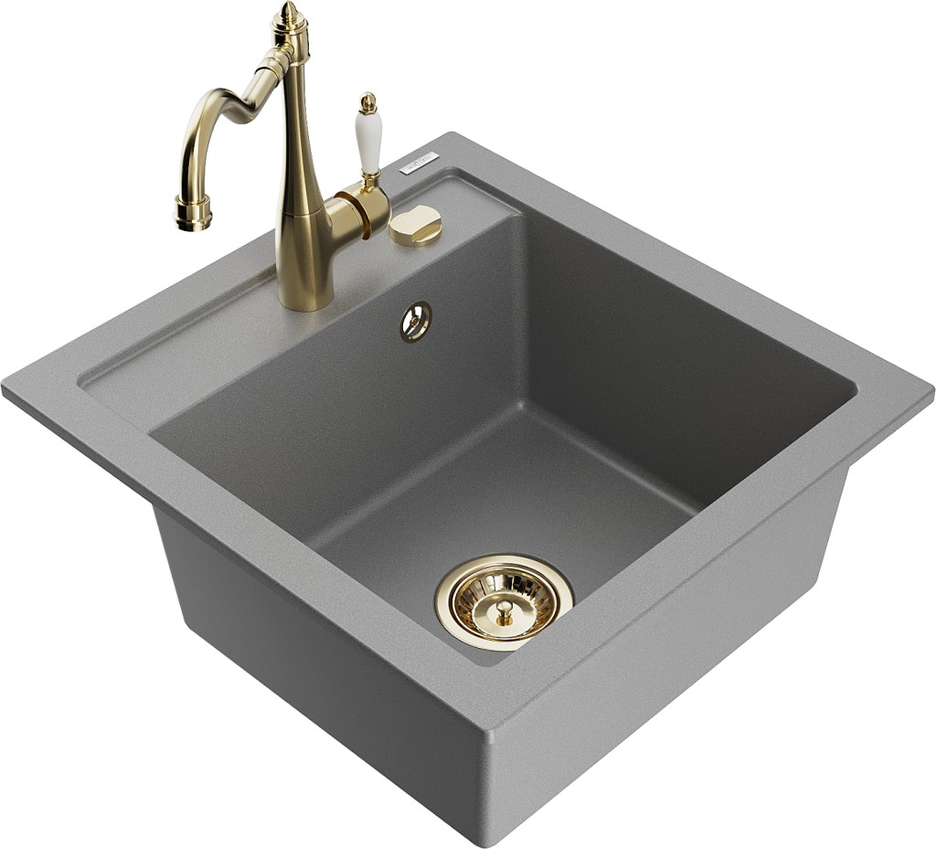 Technické dáta: drez: Rozmer: 520 x 490 x 210 mm Hĺbka komory: 200 mm Rozmery komory: 410x360 mm Priemer odtoku: ø90 mm Typ: 1-komorový Typ: Zapustené do pracovnej dosky Šedá farba Povrchová úprava sifónu: zlatá Materiál: žula (80% žulové kamenivo, 20% živice) Prepadový otvor: Áno Otvory: (batérie, automatické) 2 Vysoká odolnosť proti poškriabaniu a zmene farby Odolnosť proti tepelným šokom Ľahko čistiteľný povrch Jeden dodatočný vyfrézovaný otvor na samodierovanie ø35 kuchynská batéria: Materiál: mosadz Farba: Zlatá Hlava: Keramická Prevzdušňovač: Áno Typ: Jedna páka Výška batérie: 290 mm Rozsah výtoku: 260 mm(GT) Ean: 5905315038128