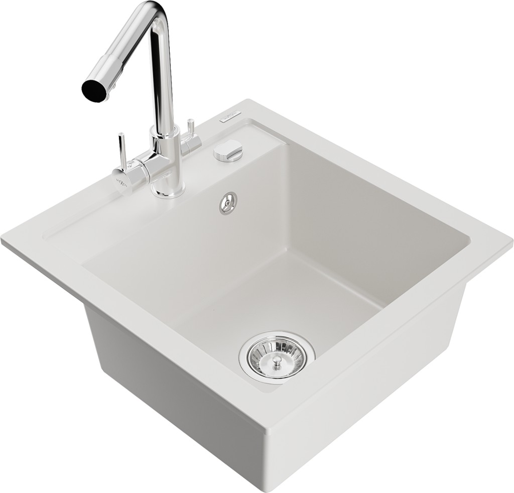 Technické dáta: drez: Rozmer: 520 x 490 x 210 mm Hĺbka komory: 200 mm Rozmery komory: 410x360 mm Priemer odtoku: ø90 mm Typ: 1-komorový Typ: Zapustené do pracovnej dosky biela farba Povrchová úprava sifónu: Chrome Materiál: žula (80% žulové kamenivo, 20% živice) Prepadový otvor: Áno Otvory: (batérie, automatické) 2 Vysoká odolnosť proti poškriabaniu a zmene farby Odolnosť proti tepelným šokom Ľahko čistiteľný povrch Jeden dodatočný vyfrézovaný otvor na samodierovanie ø35 kuchynská batéria: Materiál: mosadz Farba: Chrome Hlava: Keramická Prevzdušňovač: Áno Typ: Dve rukoväte Rozsah výtoku: 235 mm Výška batérie: 315 mm Dvojhlavá batéria s prídavným kanálom pre filtrovanú pitnú vodu (GT) Ean: 5905315022653