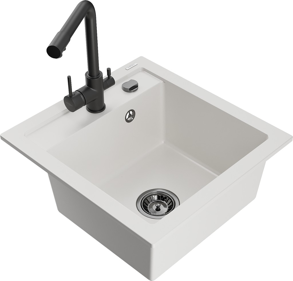 Technické dáta: drez: Rozmer: 520 x 490 x 210 mm Hĺbka komory: 200 mm Rozmery komory: 410x360 mm Priemer odtoku: ø90 mm Typ: 1-komorový Typ: Zapustené do pracovnej dosky biela farba Povrchová úprava sifónu: čierna Materiál: žula (80% žulové kamenivo, 20% živice) Prepadový otvor: Áno Otvory: (batérie, automatické) 2 Vysoká odolnosť proti poškriabaniu a zmene farby Odolnosť proti tepelným šokom Ľahko čistiteľný povrch Jeden dodatočný vyfrézovaný otvor na samodierovanie ø35 kuchynská batéria: Materiál: mosadz Čierna farba Hlava: Keramická Prevzdušňovač: Áno Typ: Dve rukoväte Rozsah výtoku: 235 mm Výška batérie: 315 mm Dvojhlavá batéria s prídavným kanálom pre filtrovanú pitnú vodu (GT) Ean: 5905315022684