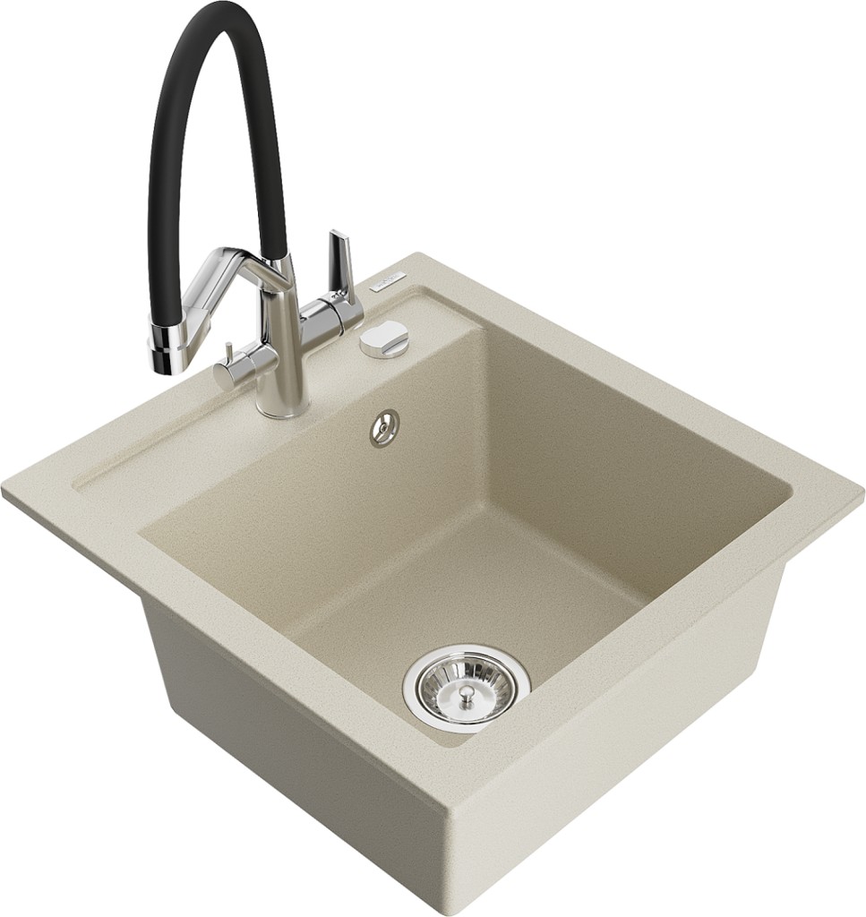 Technické dáta: drez: Rozmer: 520 x 490 x 210 mm Hĺbka komory: 200 mm Rozmery komory: 410x360 mm Priemer odtoku: ø90 mm Typ: 1-komorový Typ: Zapustené do pracovnej dosky Farba béžová Povrchová úprava sifónu: Chrome Materiál: žula (80% žulové kamenivo, 20% živice) Prepadový otvor: Áno Otvory: (batérie, automatické) 2 Vysoká odolnosť proti poškriabaniu a zmene farby Odolnosť proti tepelným šokom Ľahko čistiteľný povrch Jeden dodatočný vyfrézovaný otvor na samodierovanie ø35 kuchynská batéria: Materiál: mosadz Povrchová úprava: chróm / čierna Hlavy: Keramické Prevzdušňovač: Áno Typ hubica: Flexibilný s mosadzným držiakom Rozsah výtoku: 260 mm Výška: 405 mm Typ: Dve rukoväte Dvojhlavá batéria s prídavným filtrom na pitnú vodu(GT) Ean: 5905315043412