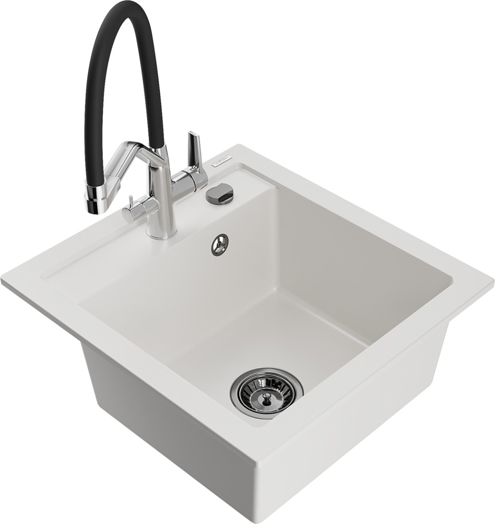 Technické dáta: drez: Rozmer: 520 x 490 x 210 mm Hĺbka komory: 200 mm Rozmery komory: 410x360 mm Priemer odtoku: ø90 mm Typ: 1-komorový Typ: Zapustené do pracovnej dosky biela farba Povrchová úprava sifónu: čierna Materiál: žula (80% žulové kamenivo, 20% živice) Prepadový otvor: Áno Otvory: (batérie, automatické) 2 Vysoká odolnosť proti poškriabaniu a zmene farby Odolnosť proti tepelným šokom Ľahko čistiteľný povrch Jeden dodatočný vyfrézovaný otvor na samodierovanie ø35 kuchynská batéria: Materiál: mosadz Povrchová úprava: chróm / čierna Hlavy: Keramické Prevzdušňovač: Áno Typ hubica: Flexibilný s mosadzným držiakom Rozsah výtoku: 260 mm Výška: 405 mm Typ: Dve rukoväte Dvojhlavá batéria s prídavným filtrom na pitnú vodu(GT) Ean: 5905315043115
